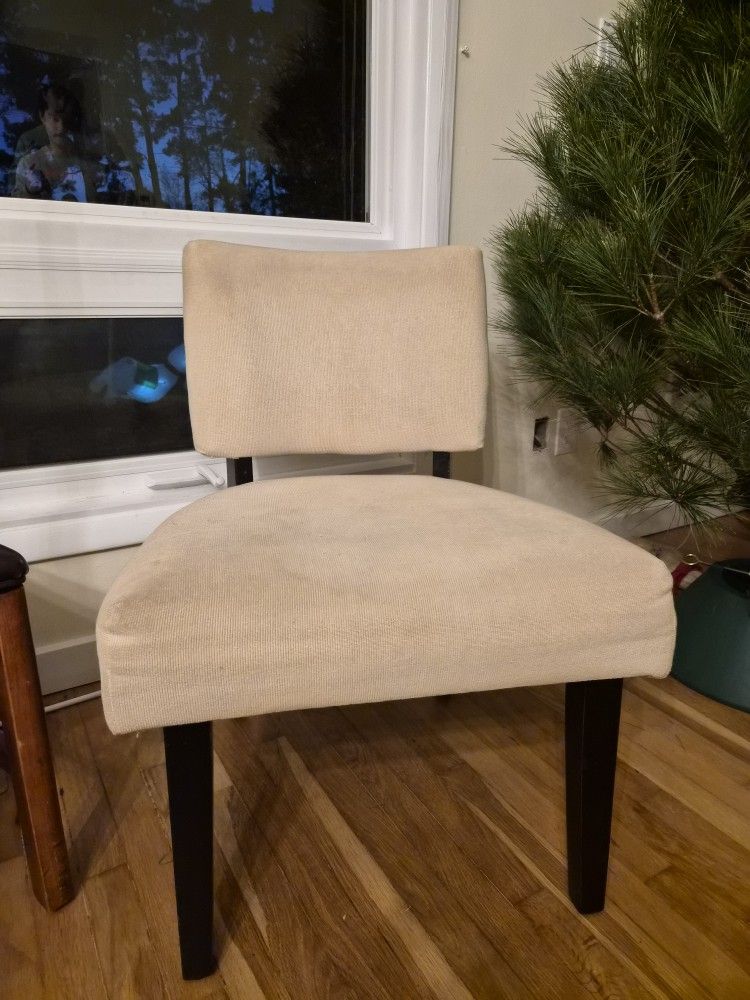 White with no staining, just wear. Wood black legs. Upholstery seat.