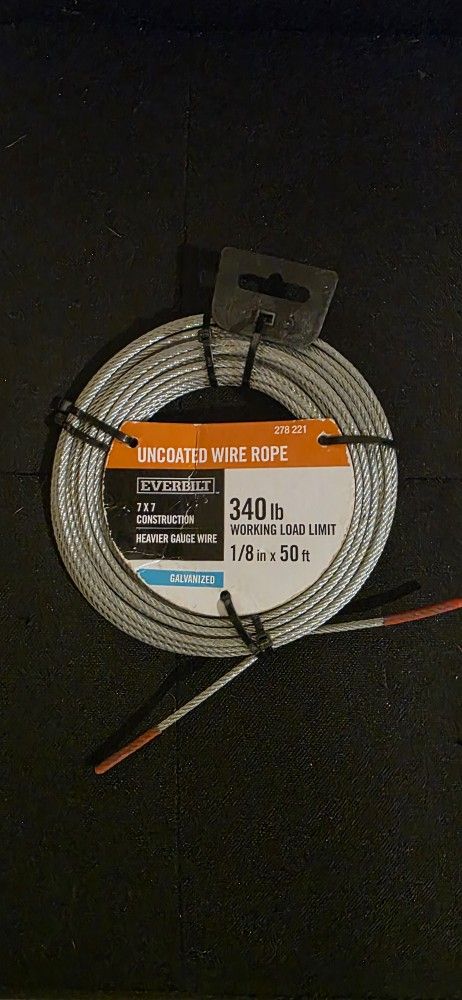 Uncoated wire rope 7x7 construction Heavier gauge wire 340 LB work Load Limit 1/8 in x 50 ft