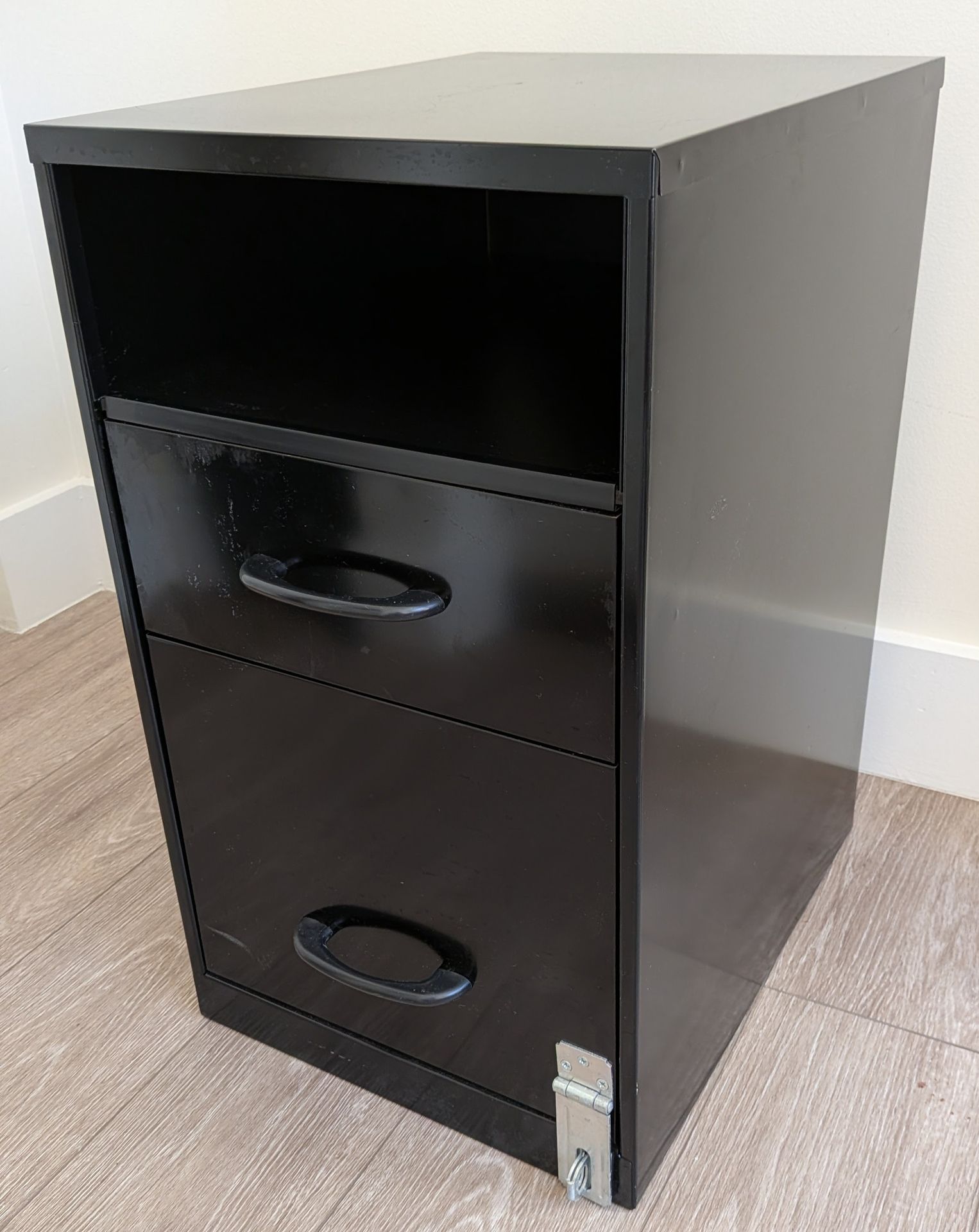 Metal file cabinet with 2 drawers, an open compartment, and a drawer organizer Dimensions: 14.25in W, 18in D, 24.5in H (more dimensions in the last picture)
