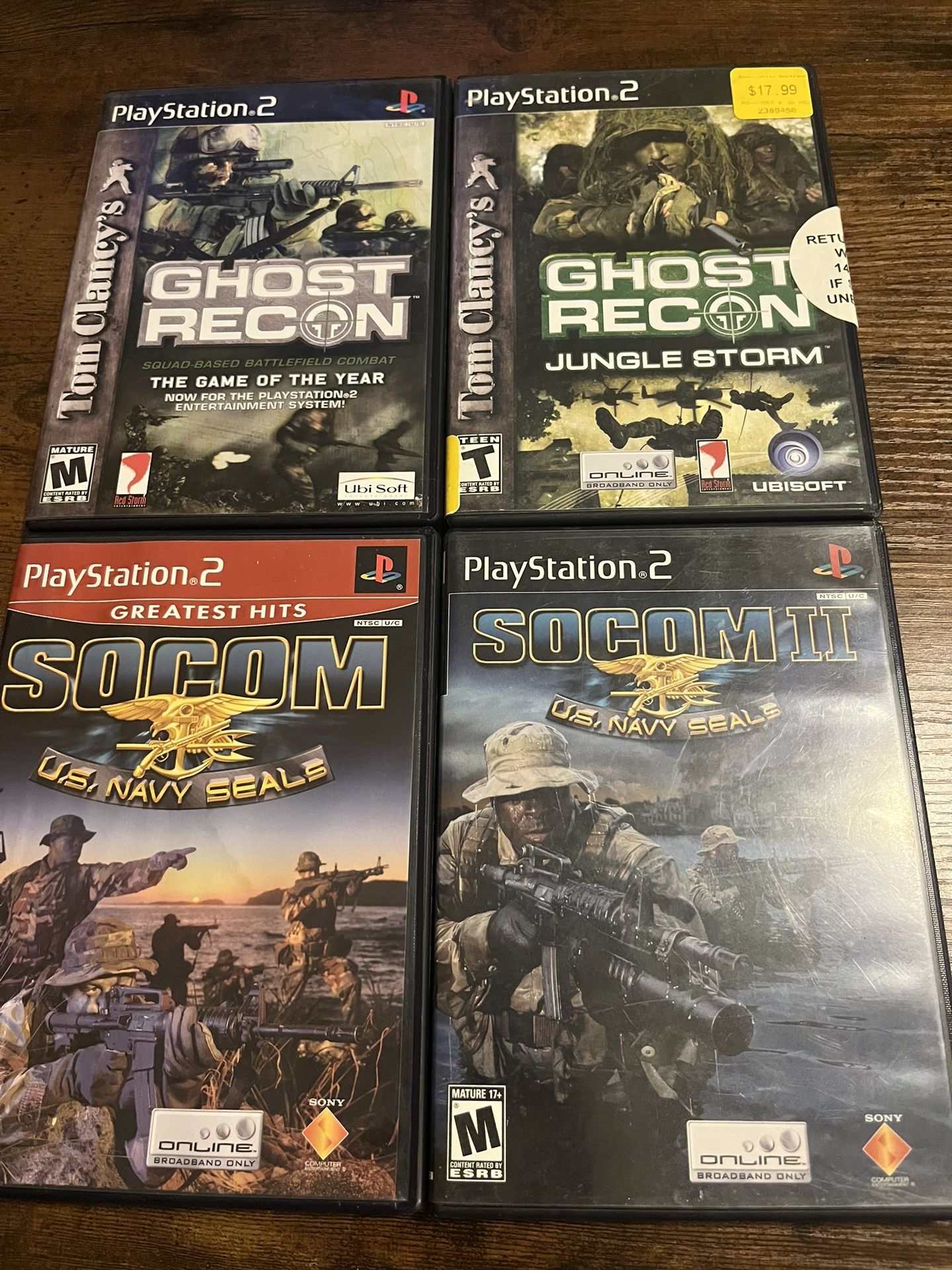 This lot includes four separate games for the Sony PlayStation 2. The games included are Socom: U.S. Navy SEALs 1 & 2, Ghost Recon, and GR Jungle Storm. All games are complete with their original packaging and manuals. The games are from Sony and fall under the shooter genre. They are perfect for fans of tactical military games. The photos provided represent the exact item you will be receiving. Feel free to message me with any questions.