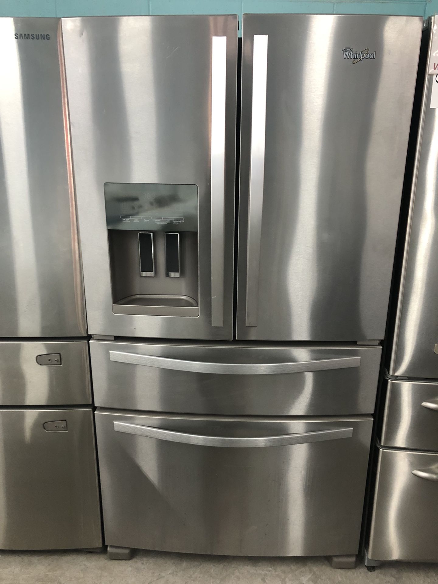Whirlpool 28 cubic foot stainless 4 door french door refrigerator, 35 3/4” wide 68” high 32” deep. Food section has spill proof glass shelves 2 crispers and gallon size door door bins. Middle draw is deli draw with temperature control. Bottom draw is freezer with 2 fully extendable baskets. Refrigerator is plugged in and running. Comes with 120 day warranty. Financing and delivery available.