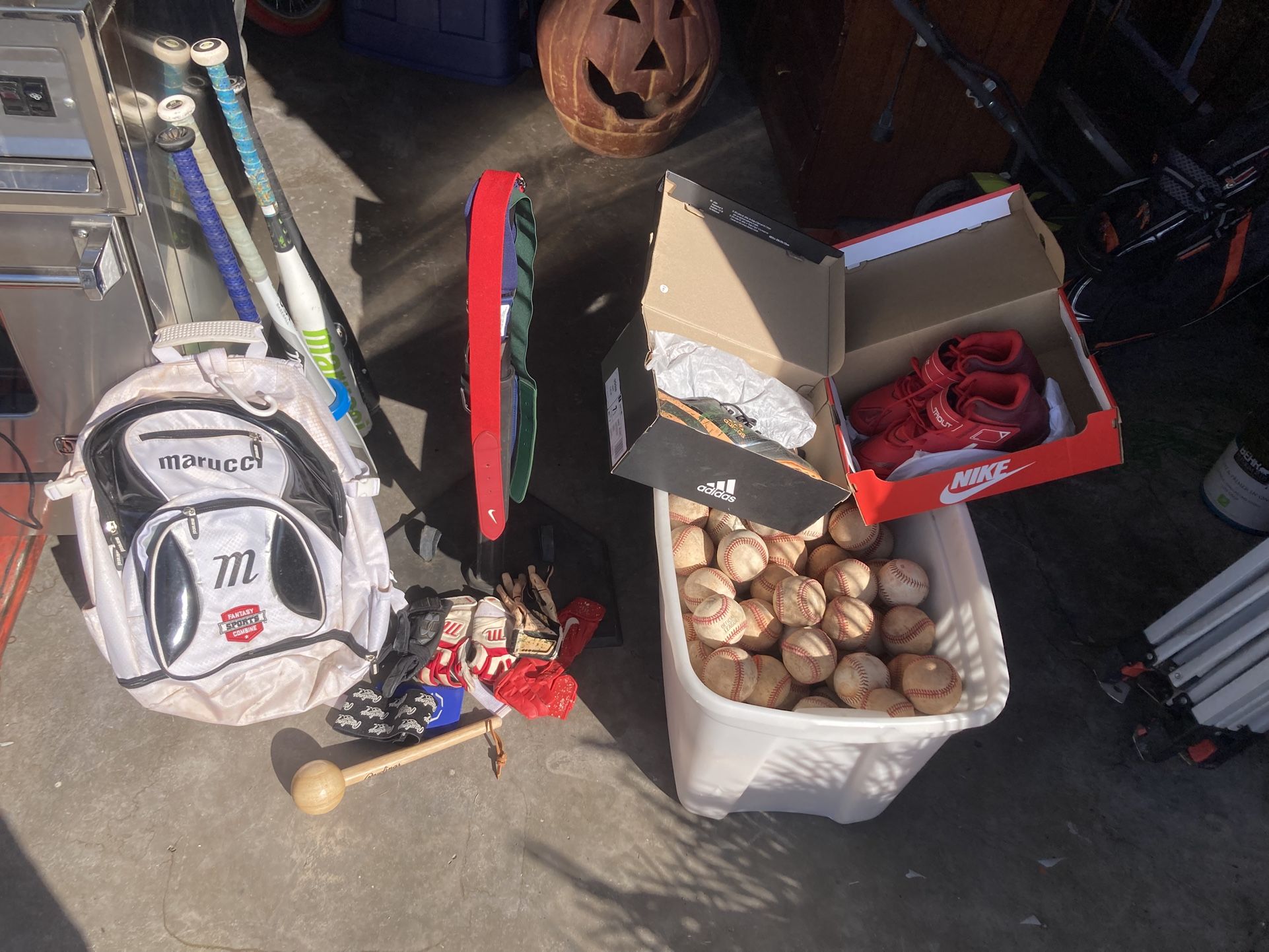 Hi selling my baseball bats, belts, shoes, t-stick, batting gloves, and backpack. Asking $300. 100+ baseballs