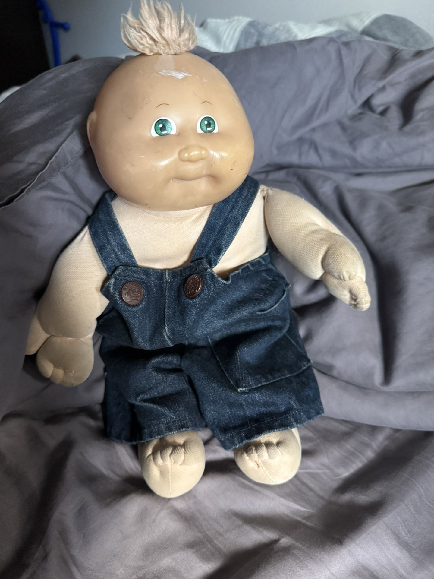 80/90’s cabbage patch doll Short hair blue eye boy Some blemishes as seen in pictures, a few marks on face/head, a small tear in shoulder, and fabric on the back is “beaded”. Willing to shop just not though this app because I don’t seem to get my payment from OfferUp.