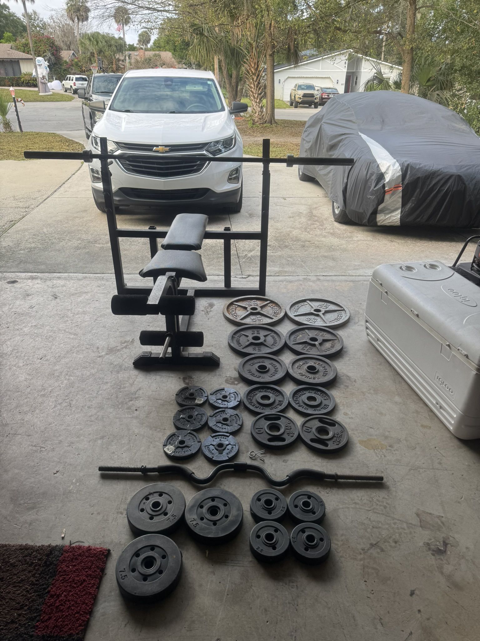 Bench press 45LB bar with all metal weights that’s last forever bench is included as well with small curling bar an a few plastic covered cement weights $400 or best offer!!