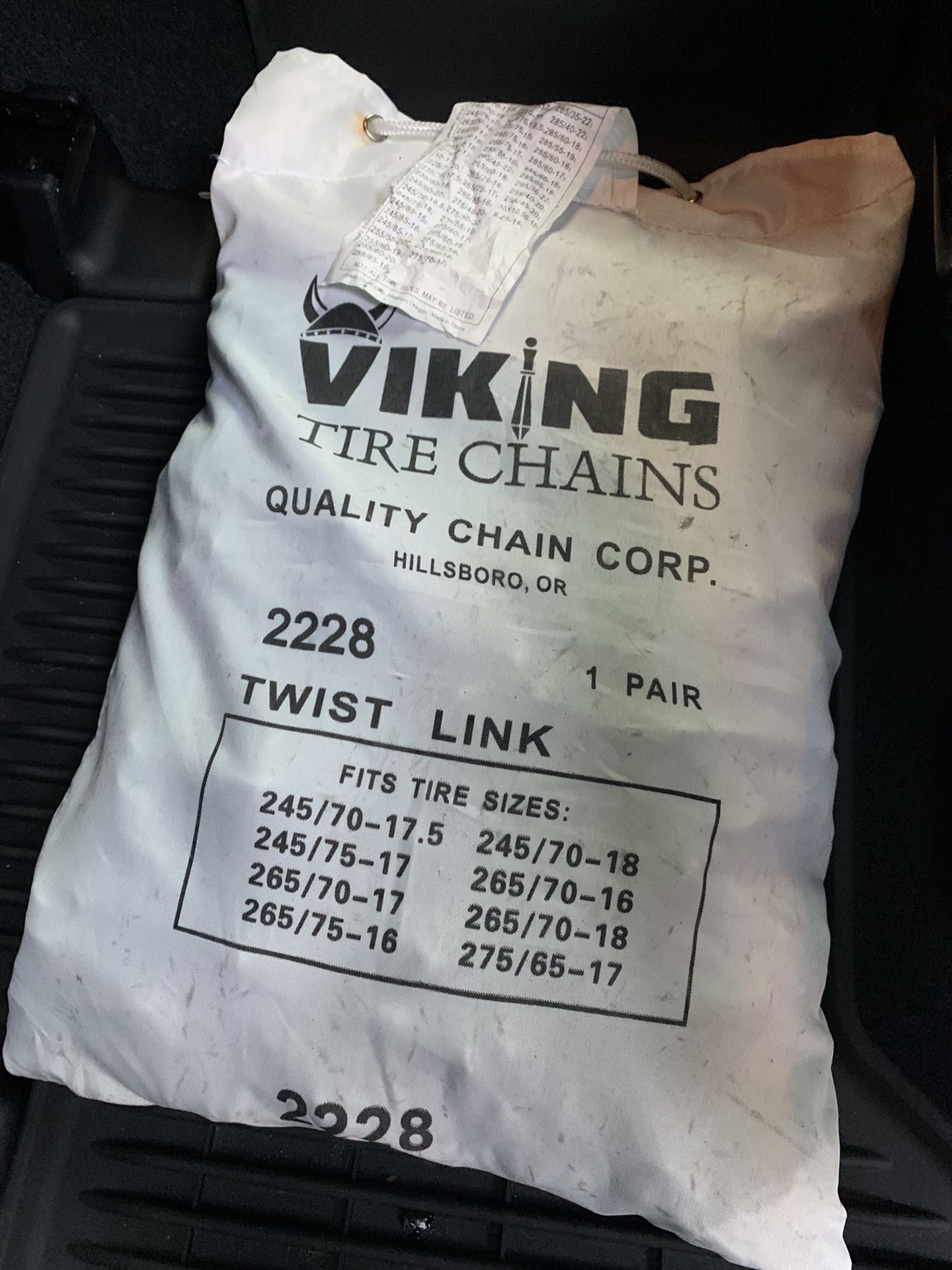 Please view picture for what size tire the chains work for. Also comes with the tensioner. Brand new, unopened, and never used.