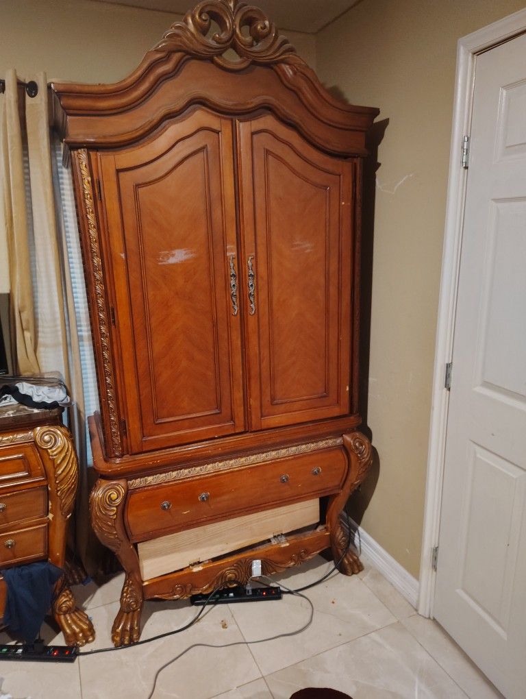 Wooden Armoire Wardrobe Closet with 2 Drawers Broken if you know how to fix would be good project. Free heavy need help picking up I can't move it