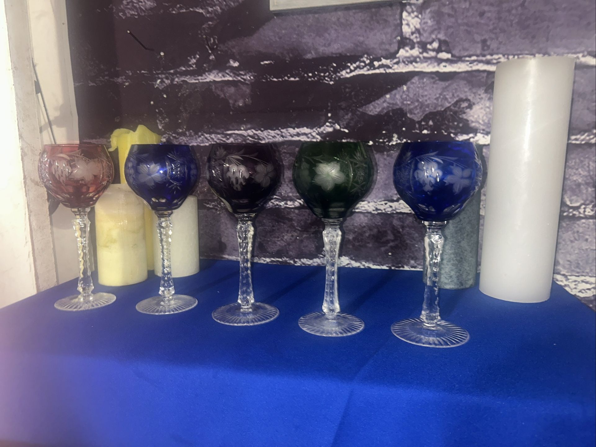 A vintage set of wine glasses from Bavaria featured Grapevine pattern in purple cobalt, blue, ruby red and green colors made of crystal with a glossy finish