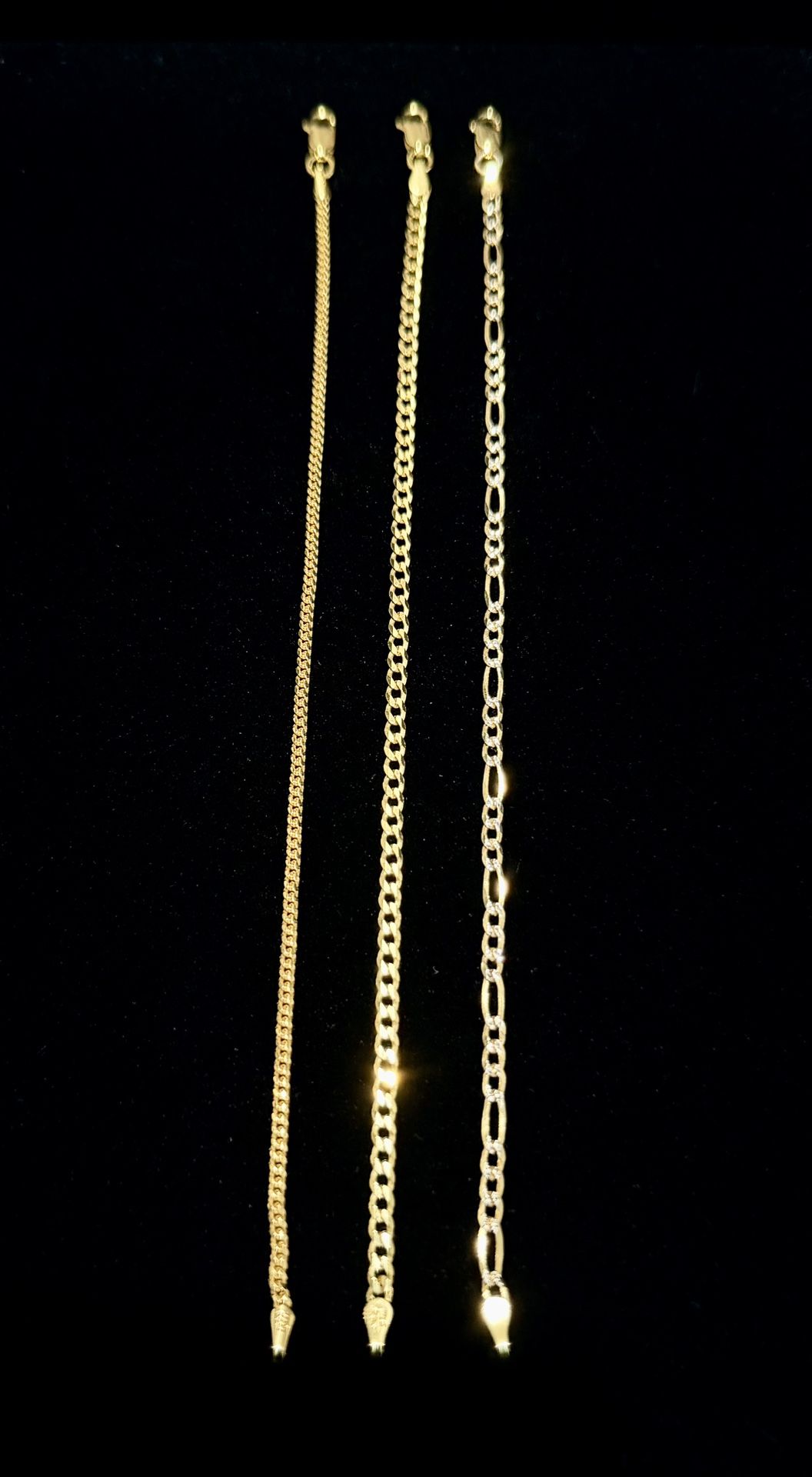 Brand new, never worn! 7 inches Gold plated 925 Sterling Silver Italian made 2.7mm Curb link 2mm Cuban link 2.6mm Fígaro link Ignore tags: 10k 14k 18k