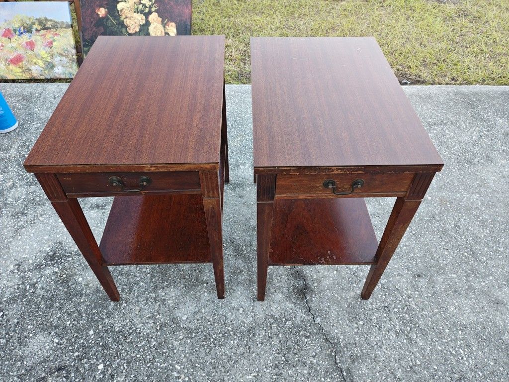 Vintage Mersman End Table Pair - A Great Restoration Project! Selling a matching pair of quality vintage end tables made by the renowned Mersman Tables company (stamp found inside the drawer). Mersman is known for well-made, solid furniture, and these classic tables are ready for a new finish. Style & Construction: Traditional/Federal Revival Style Dark mahogany finish (likely veneer over a solid wood core) Features one dovetail drawer for storage Includes a lower shelf/tier for display Attractive brass-style drop pull hardware Dimensions (Approximate): 23.5" Wide x 15.5" Deep x 24" High Condition (Please Read): As-Is Condition: These tables will need restoration. They are structurally sound, but the finish has numerous dings, dents, and surface scratches consistent with their age. The surface veneer is intact but worn. Perfect for a furniture flipper, DIY restorer, or anyone looking to paint/refinish them! Selling Notes: Selling as a pair only. Cash or secure payment methods only. Pickup only. Will need a vehicle large enough to transport two tables.