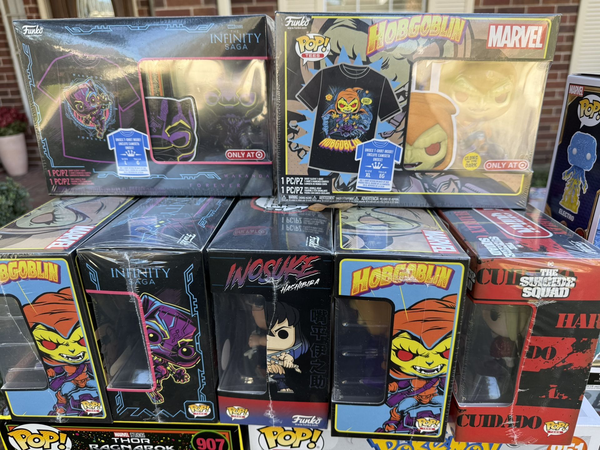 Funko Pop & Tees $25ea or take the lot for $140 (3) Hobogoblin (Marvel) (2) Black Panther (Marvel) (1) Inosuke (Demon Slayer) (1) Harley Quinn (DC Comics) Will trade for Pokemon Cards as well