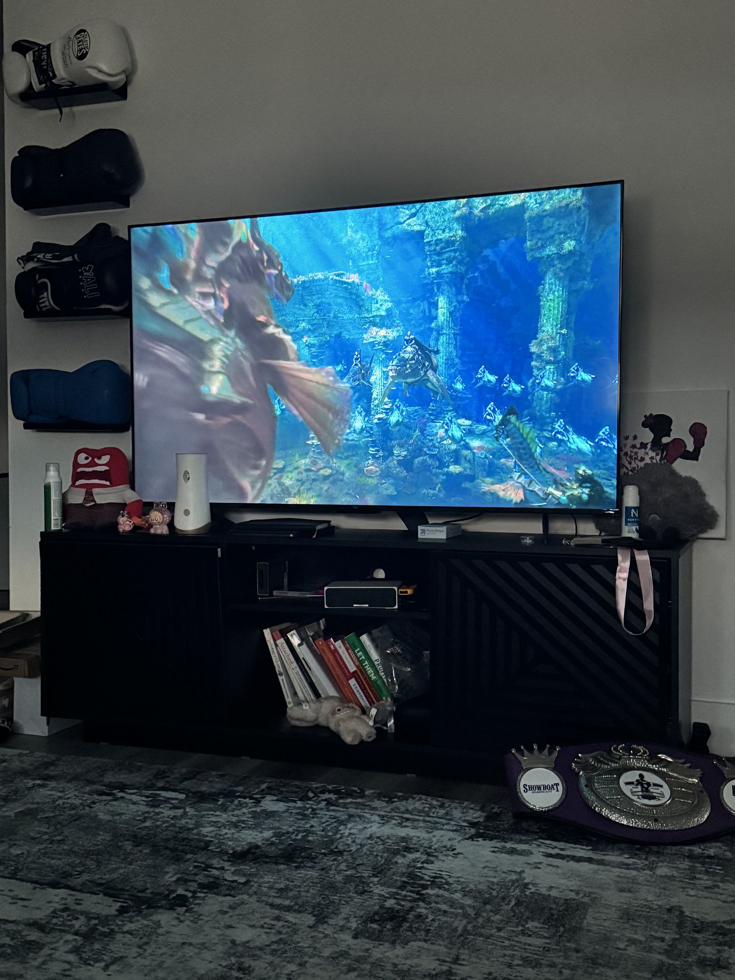 Modern 70” TV Stand for Living Room or Bedroom, Entertainment Center with Two Cabinets and Storage, Black TV Stand with Cable Management fits Screens up to 70" When Measured Diagonally, Black Purchased from Amazon lightly used it looks brand new and comes put together. Only one year old