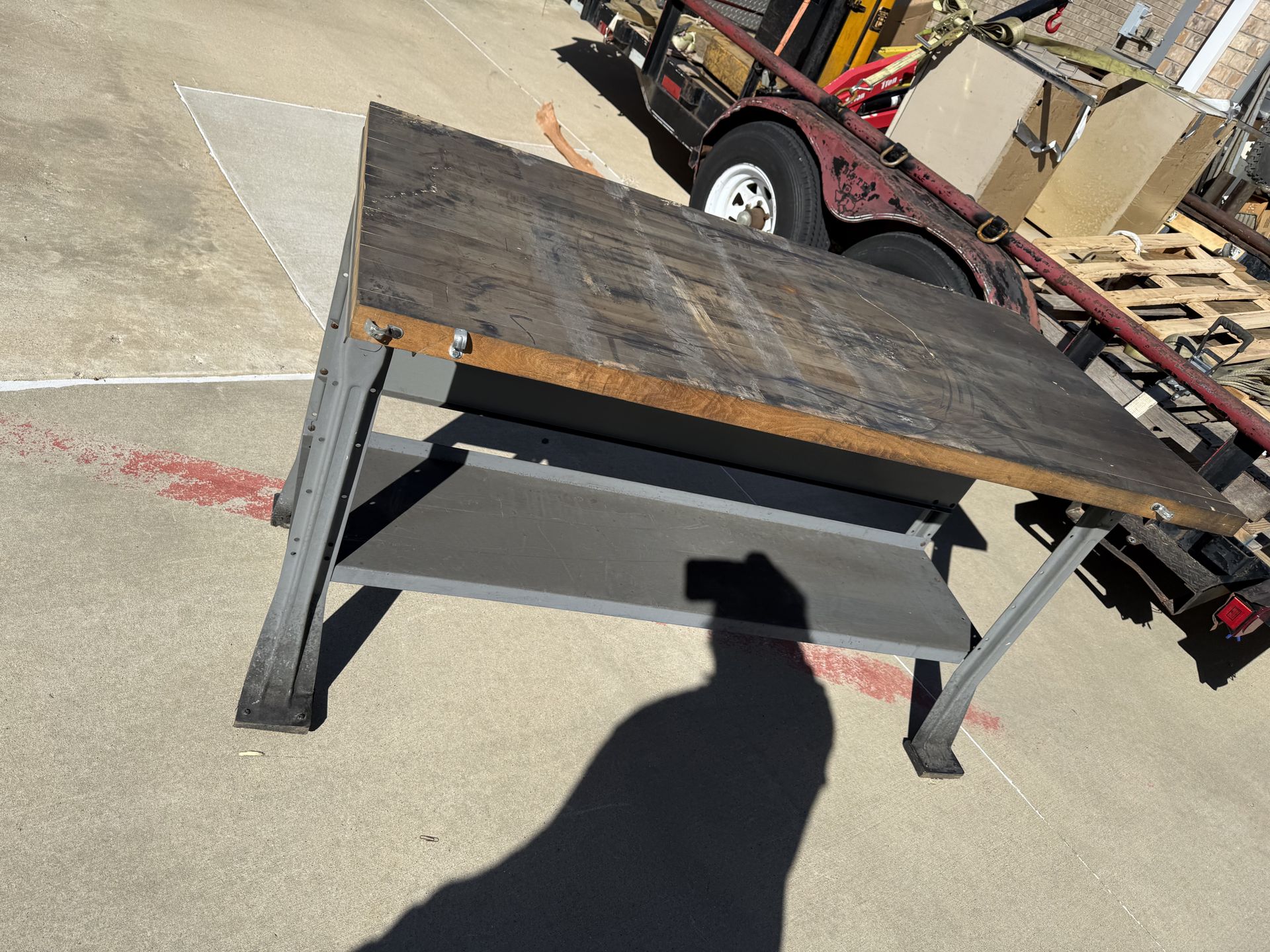 Heavy-duty industrial workbench with a solid butcher-block style wood top and steel frame. This is a stout, shop-ready table — perfect for a garage, fabrication shop, warehouse, or workspace setup. • Dimensions: 60” L x 30” W x 34” H • Thick solid wood top (approx. 2”+ thick) • Heavy-duty steel frame construction • Lower steel shelf for storage • Adjustable/leveling feet • Extremely sturdy – built for real shop use ⚠️ Condition: Used shop table — top shows cosmetic wear, stains, and marks from use (see photos). Structurally solid and ready to work. Could easily be resurfaced if you want a clean finish.