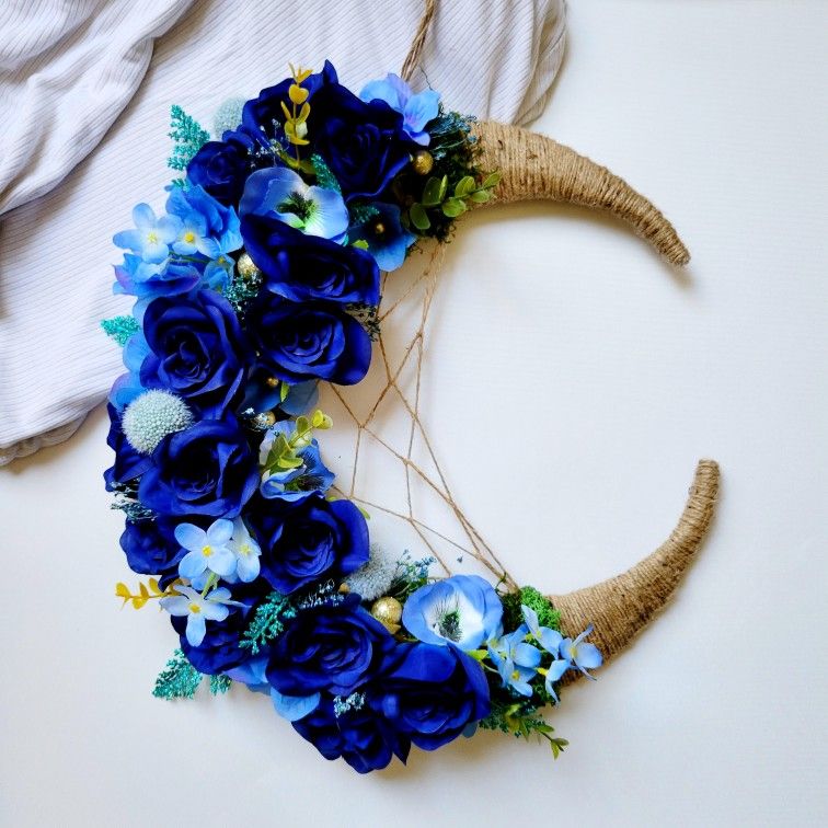 The phases of the moon offer an accessible way to connect with nature and her rhythms. The crescent moon is an iconic sight in the night sky and it's a sign of fertility. Gazing at this sight in the night sky reminds you to fan the flames of the intentions and dreams you imagined. The crescent moon represents a time of new beginnings. This is a time when you should start new projects or add new things into your life. The wreath was made with mosses and artificial flowers. It's 16 inches long.