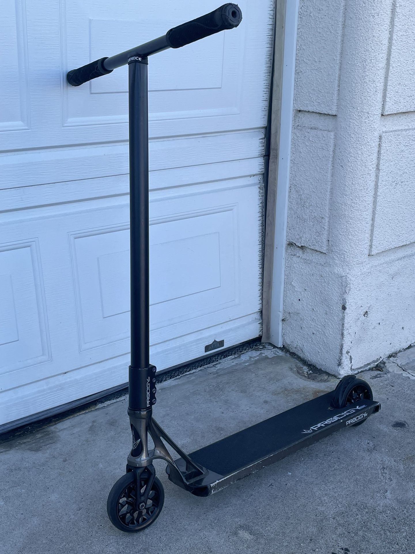 Selling a Prodigy ST stunt scooter. Bought it new for $250 last year for my birthday. The scooter is in good condition — I rode it carefully and maintained it regularly. Cosmetic condition: – 3 dents on the deck – scratches on the deck – very minor scratches on the bars Technical condition: – bearings are in perfect condition – clamp is solid and works perfectly – completely stock (no parts changed) The scooter was always cleaned and well taken care of — not beat up. Price is negotiable (open to offers). Message me if interested.