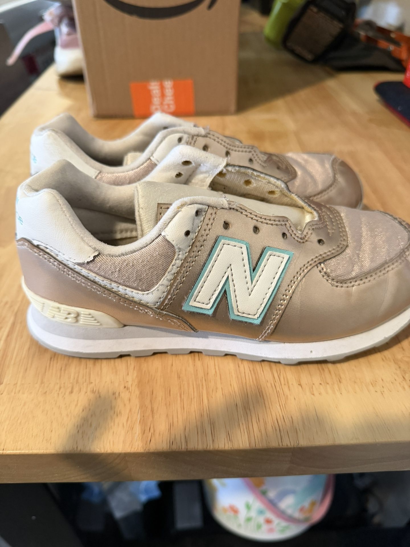 Gently use New Balance 574’s metallic rose gold with turquoise size 1.5 shoelaces are missing asking for $15 pick up near Moreno Beach Drive and cactus Avenue in Moreno Valley