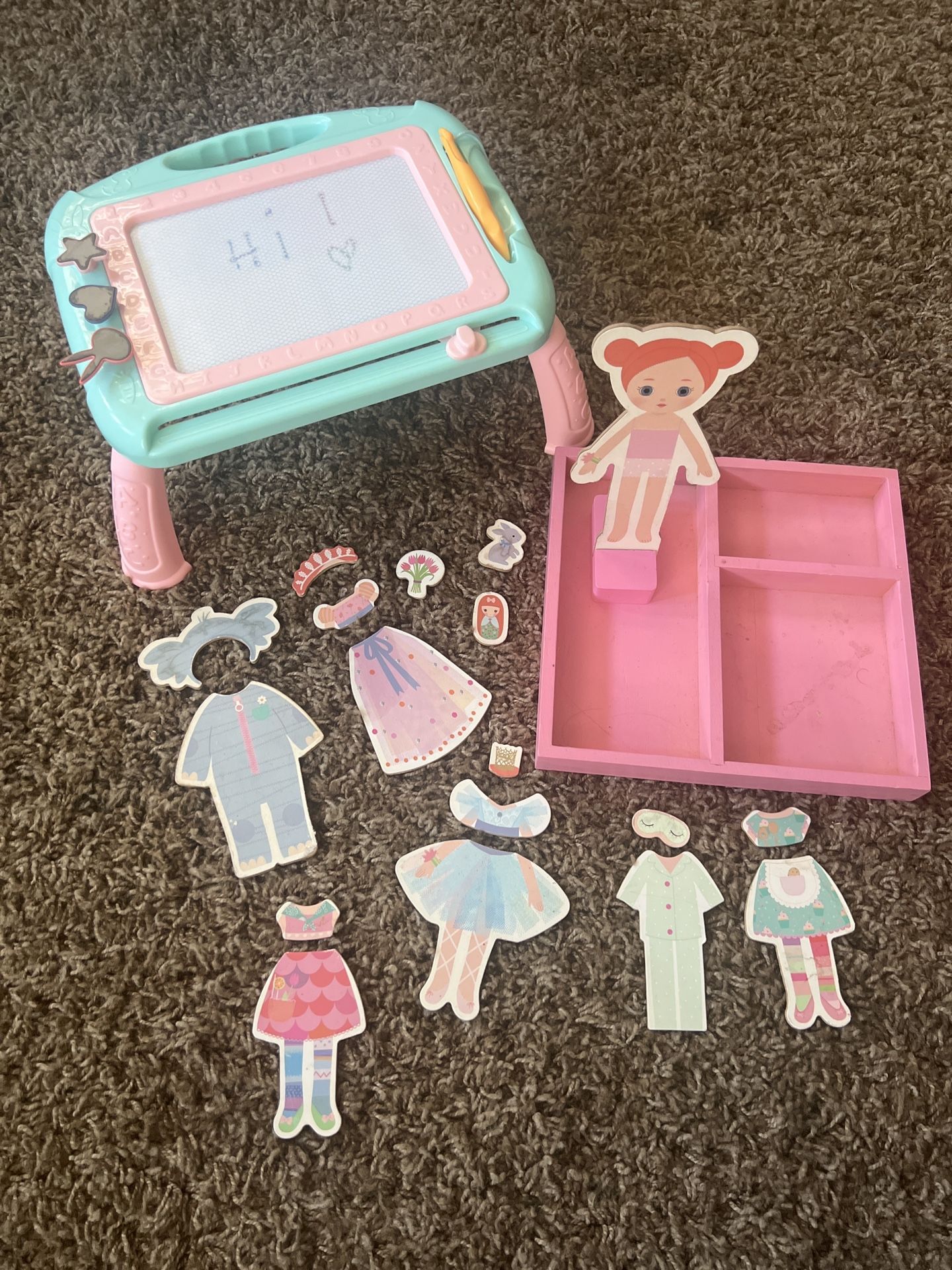 Wooden Magnetic Paper Doll Set and Magna Doodle Board for sale – includes a fun magnetic dress-up doll with multiple outfit pieces and accessories, plus a colorful magna doodle board for creative drawing and doodling. Both items are in good condition, perfect for imaginative play and artistic expression!