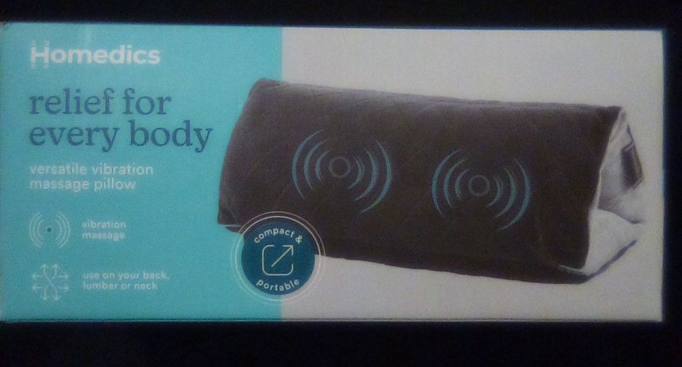 New in box Versatile vibration Can be used on back,lumbar,or neck Relaxes overworked muscle's You can unzip and lie flat for more back and seat coverage . portable for on the go, use zipped for lumbar support or neck roll Requires 2AA BATTERIES NOT INCLUDED