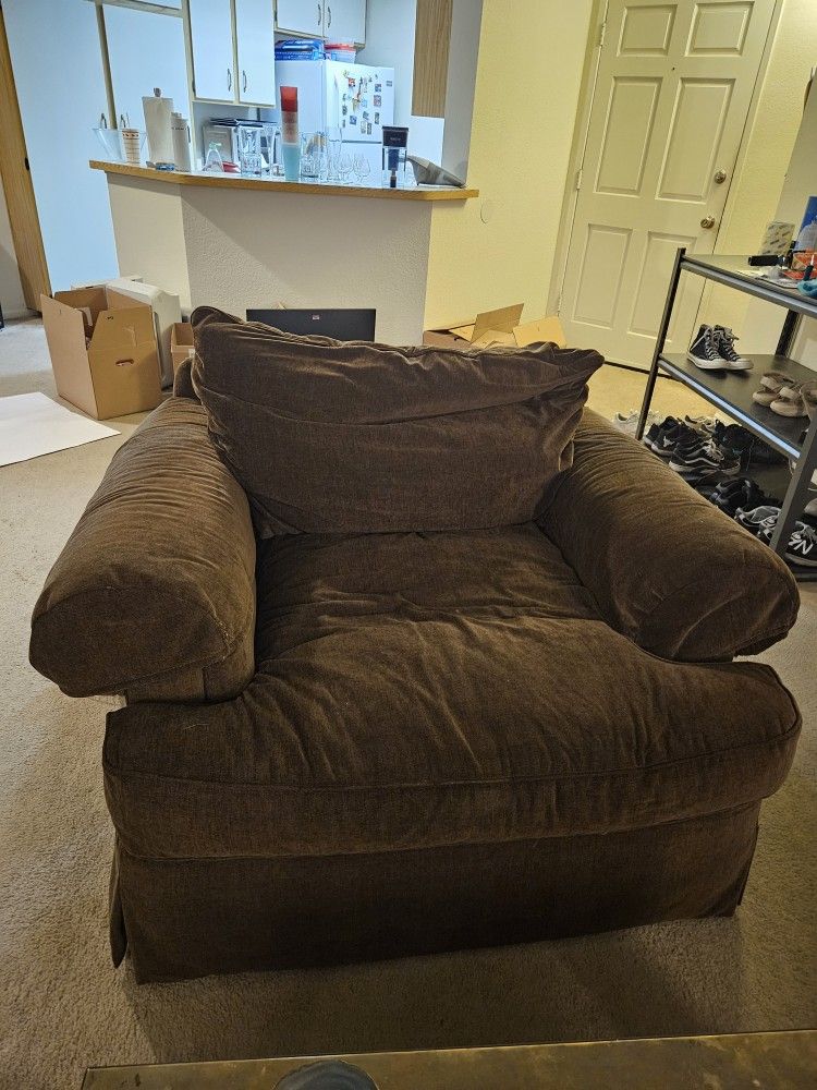 Super comfy giant brown chair/loveseat Good condition with small scuff on the back. Must be able to pick up and transport on your own. 50" wide × 48" deep