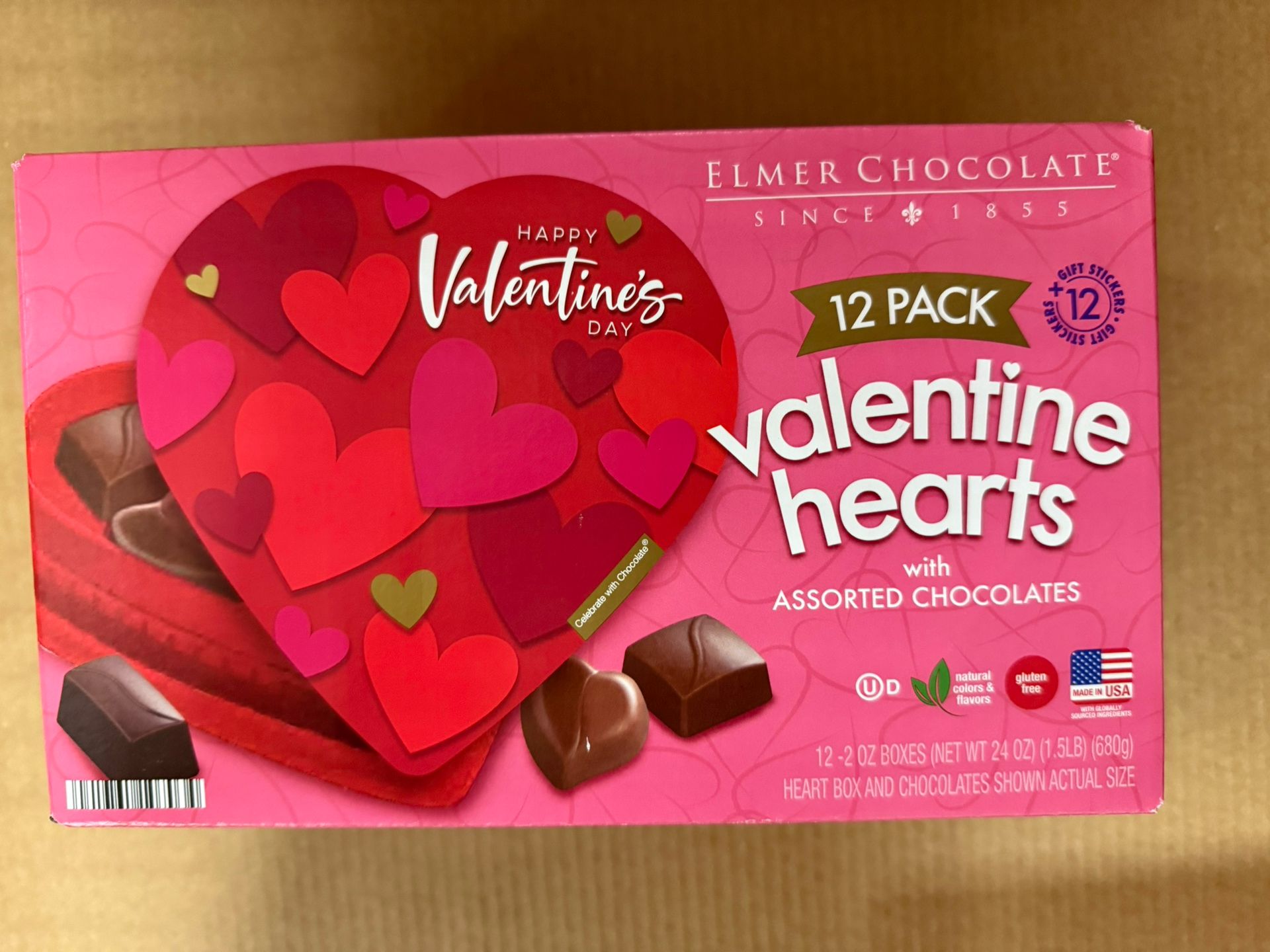 Each heart has 6 chocolates Small size 2oz I have 50 boxes Each box has 12 packs