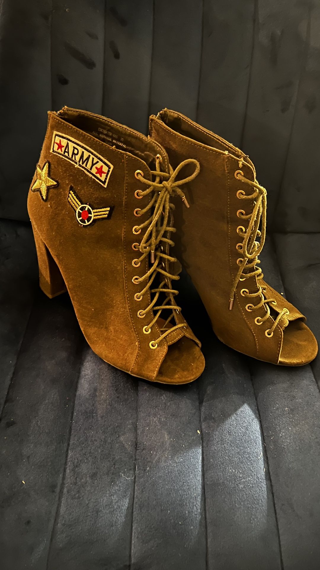 Elevate your style with these BAMBOO lace-up boots, featuring a rich army green hue and a chunky high heel for added height and comfort. Zips up the back. The prominent lacing system and luxurious material make these boots a standout choice for any occasion.
