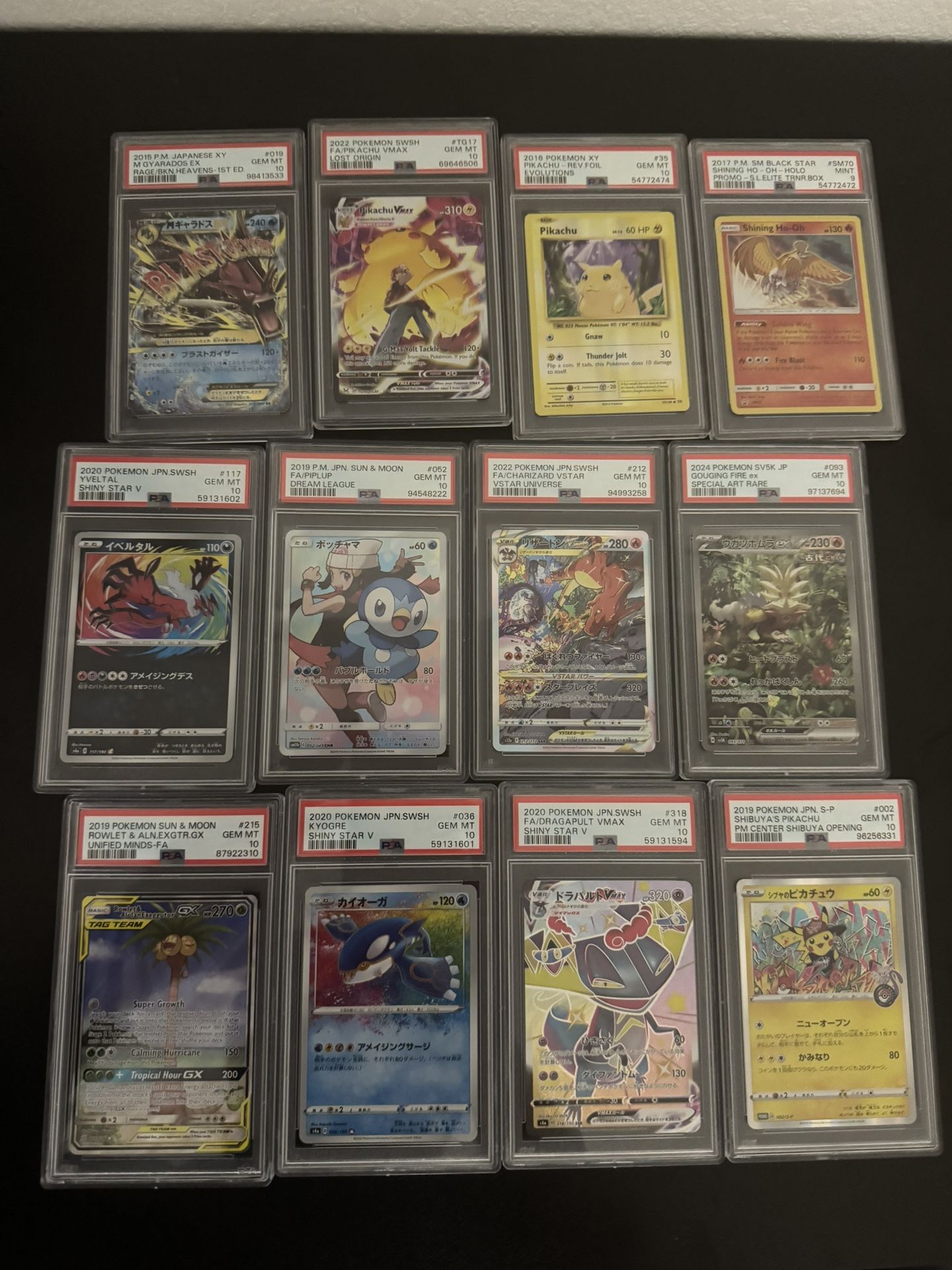 Graded pokemon cards from PSA M GYARADOS EX PSA 10 JP - $150 Lost Origin Pikachu VMAX #TG17/TG30 - $170 Pikachu Reverse Holo 35/108 -$70 Shining Ho-Oh Holo SM70 Sun and Moon Black star promo Pokemon PSA 9 - $40 Japanese Shiny Star V Yveltal Amazing Rare PSA 10 #117 - $20 Piplup Dream League Japanese Character Rare Full Art #052 PSA 10 -$125 Charizard VSTAR 2022 FA s12a VSTAR Universe SAR Japanese 212/172 PSA 10 -$150 Pokemon Card PSA 10 GOUGING FIRE EX #093 SV Wild Force-$75 2019 Pokémon Rowlet & Alolan Exeggutor GX Tag Team Unified Minds Alt FA PSA 10 -$350 Kyogre Shiny Star V Japanese Amazing Rare #036 PSA 10 Gem Mint -$30 Dragapult VMAX SSR Japanese S4a Shiny Star V 318/190 PSA 10 - $35 Shibuya's Pikachu P.M. Center Opening Japanese Holo Promo 002/S-P PSA 10 -$215 Japanese Sobble 224/190 S Holo - Shiny Star V s4a psa 10 - $20 Japanese Sobble 224/190 S Holo - Shiny Star V s4a PSA 10 - $20 2020 Pokemon Shiny Star V Centiskorch V 309/190 Japanese Full Art Rare PSA 10-$20 2020 Pokemon Japanese SWSH Shiny Star V #306 Full Art Eldegoss V PSA 10 - $25 Corvisquire 301/190 PSA 10 Gem Mint - Japanese Holo Pokemon Shiny Star V -$25 2020 POKEMON JAPANESE SWSH DEDENNE 250/190 SHINY STAR V PSA 10 -$25 Flareon GX #1 Pokemon Japanese sm1 psa 10 - $60 Miscut (OC) XY Evolutions PSA 9 Mint Zapdos Holo 42/108 2016 Pokemon -$40