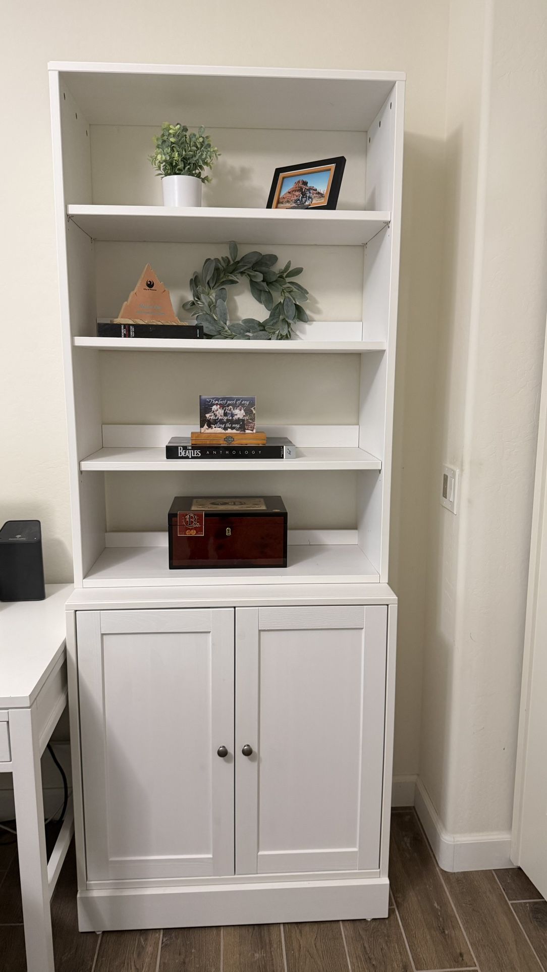 White Book Shelf With Storage Cabinet for $85. Approximate Measurements are: 48” high, 32” wide and 13.5” depth. Items on the shelf are not included in this price. Take a look at 2 other office items I have for sale…Makes for a nice office set up.