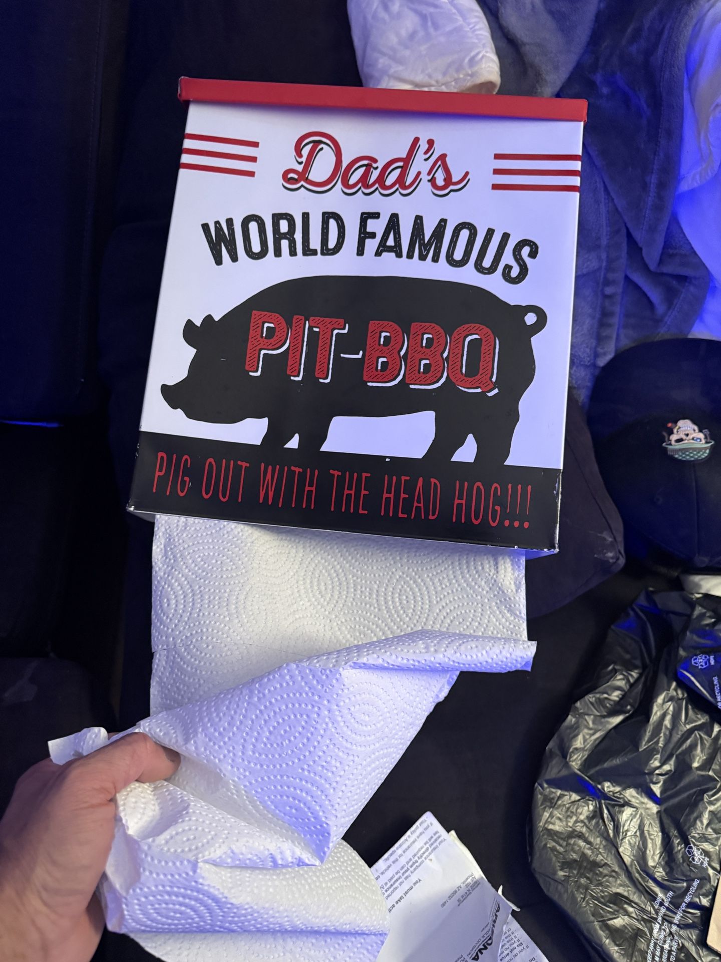 Metal paper towel dispenser simple , yet contemporary in its own way. “ Dads world famous Pit- BBQ Pig out with the Head Hog!!!” Good piece for back yard BBQ areas