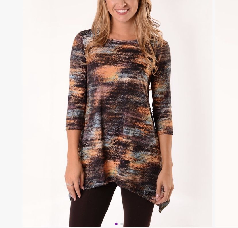 Size: XL. Women’s ‘Brown and Orange Abstract Sidetail Tunic’. Lbisse brand from Zulily. 3/4 sleeve. 95% polyester, 5% spandex. Perfect condition- never worn. Beautiful and unique! SHIPPING ONLY