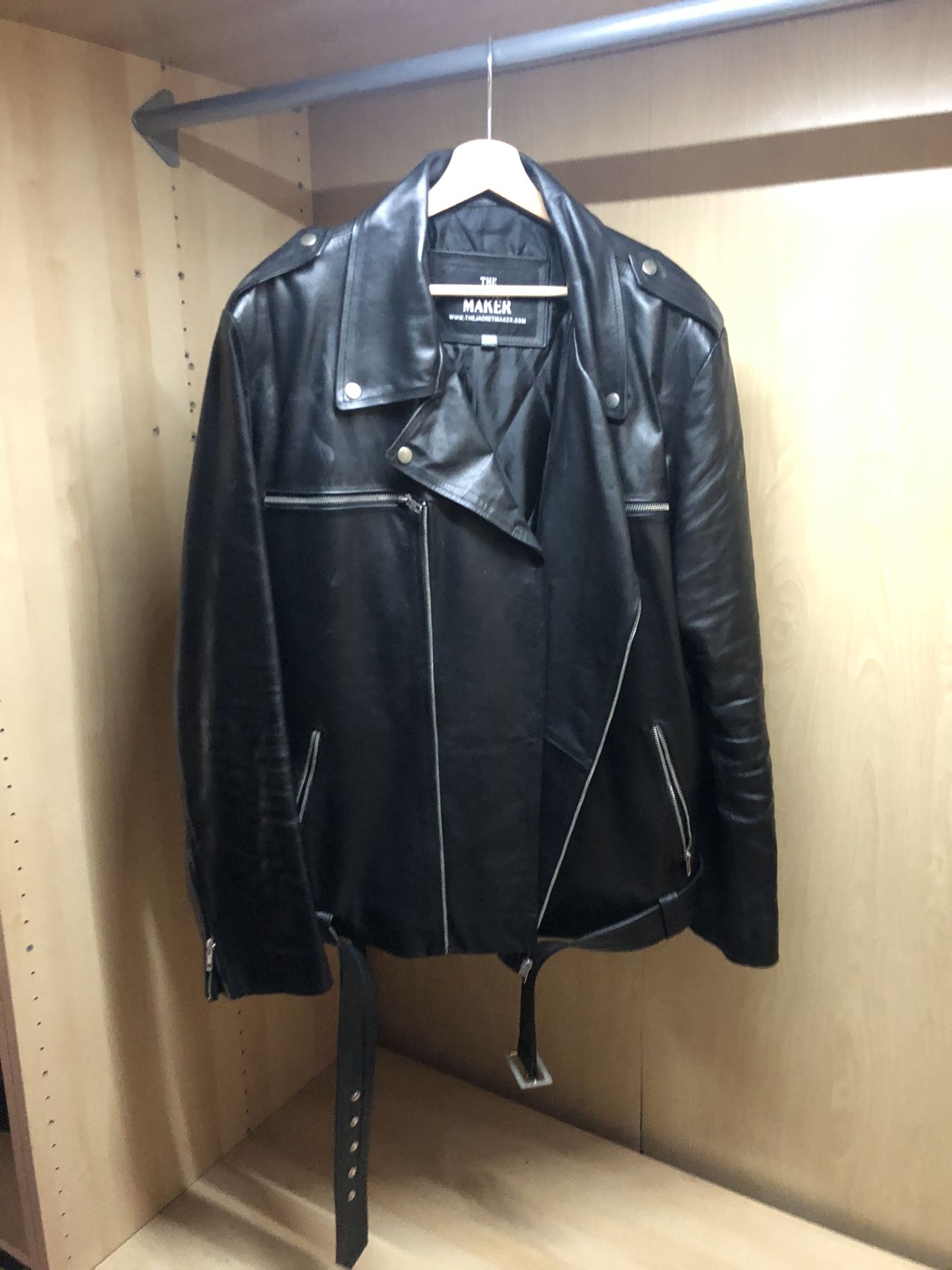 Custom tailored %100 cow hide leather worn once or twice was a Christmas gift but was always too big. 46-47 IN (Chest) 42-43 IN (Waist) 27 IN (Sleeves) Outer Shell: Real Leather Leather Type: Cow hide Leather Finish: Semi-aniline Inner Shell: Quilted viscose lining Closure Style: Zipper & Waist belt Collar Style: Notch Cuffs Style: Zipper Inside Pockets: Two Outside Pockets: Three Color: Black