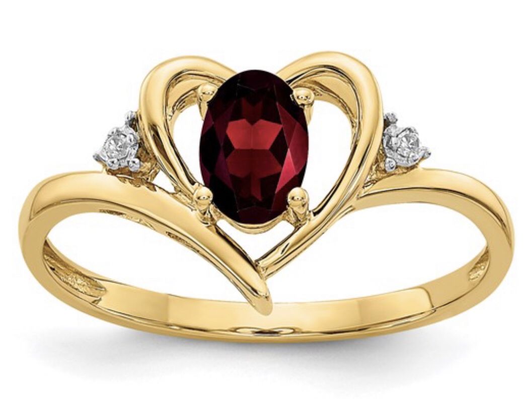 14K heart ring with Oval Garnet. This ring has dimond accents. It is a size 7. This is sizable. Additional cost for sizing is paid by buyer depending upon the required size.