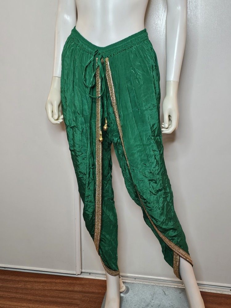 Stylish green harem pants featuring elegant gold trim. Perfect for a chic and comfortable look.