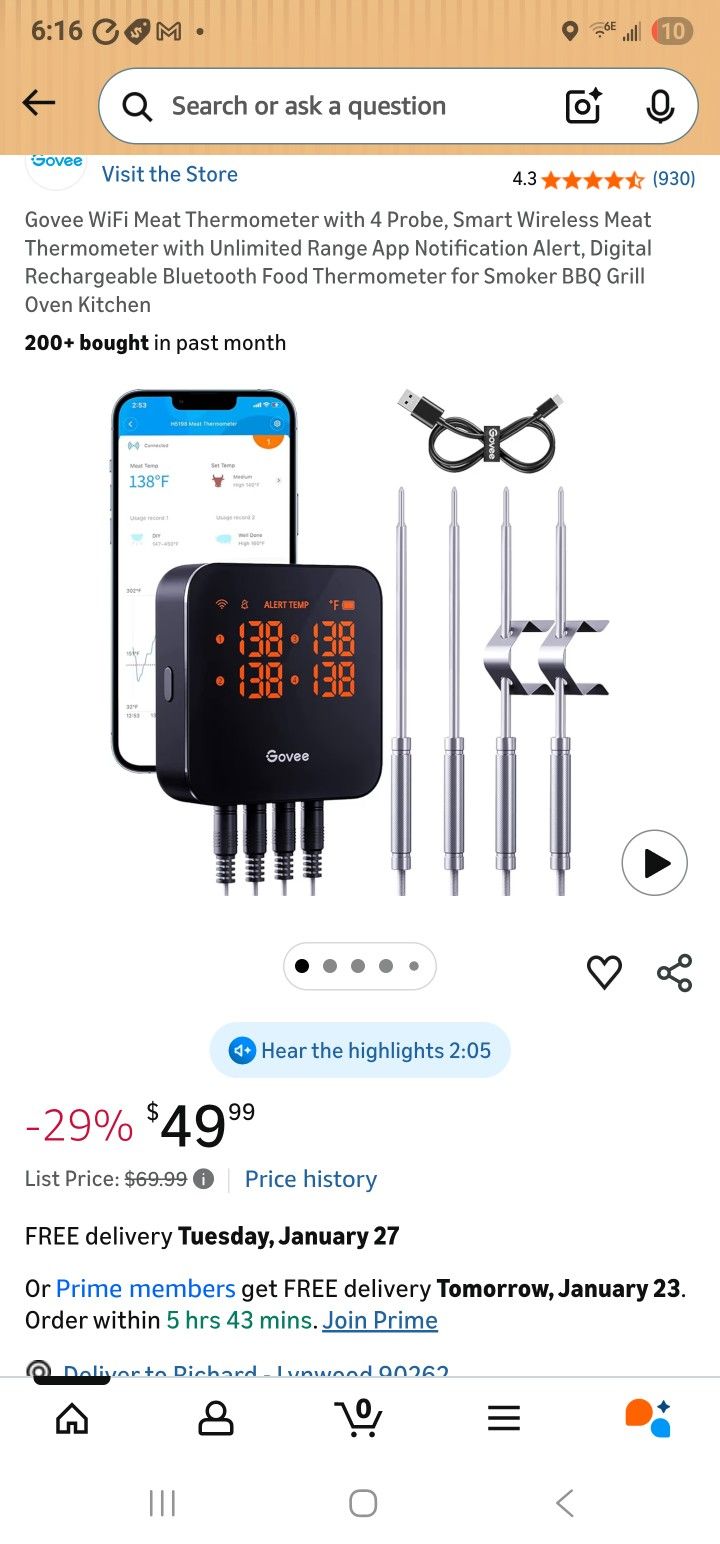 Govee WiFi Meat Thermometer with 4 Probe, Smart Wireless Meat Thermometer with Unlimited Range App Notification Alert, Digital Rechargeable Bluetooth