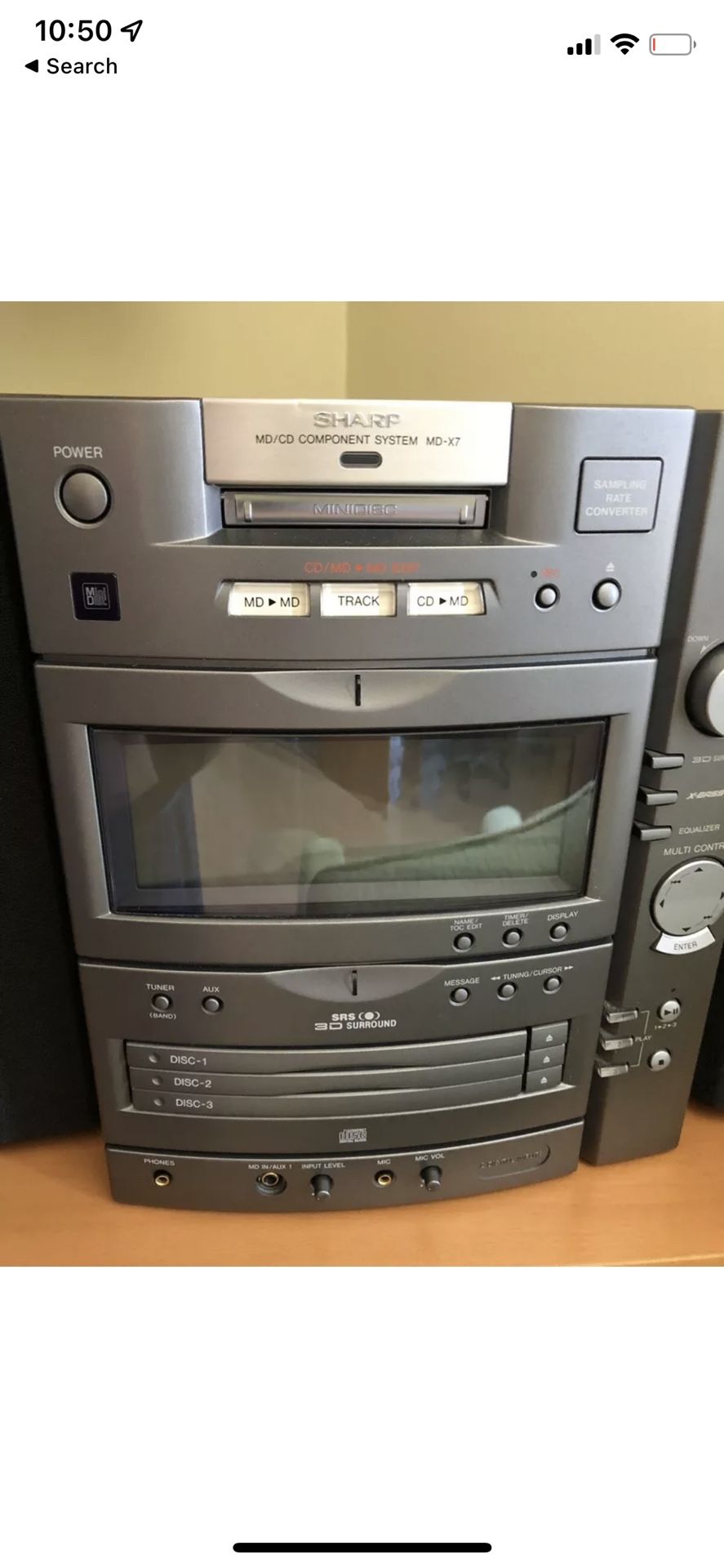 Tiny dent on the front top, near Sharp sign AM/FM Stereo Tuner receives AM, FM, and FM stereo broadcasts. 3-Disc CD Changer accepts up to 3 CDs in the convenient changer mechanism. MiniDisc Recorder plays and records digital quality MiniDiscs.