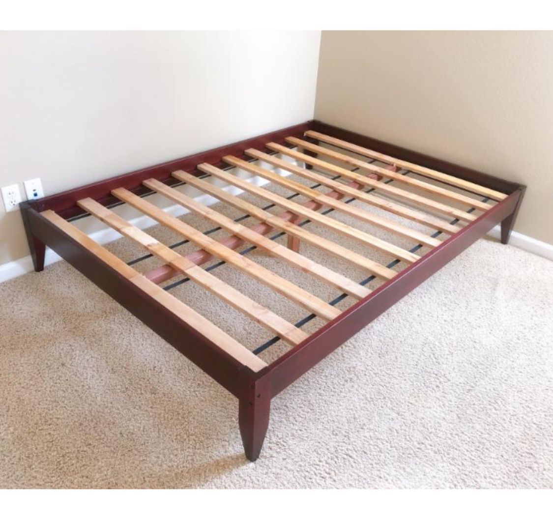 Very nice well kept frame. Website photo in a different shade, and other photos show all pieces. Laquered wood. Great piece of furniture. Downsizing and moving. I never did the screws so it is like new.