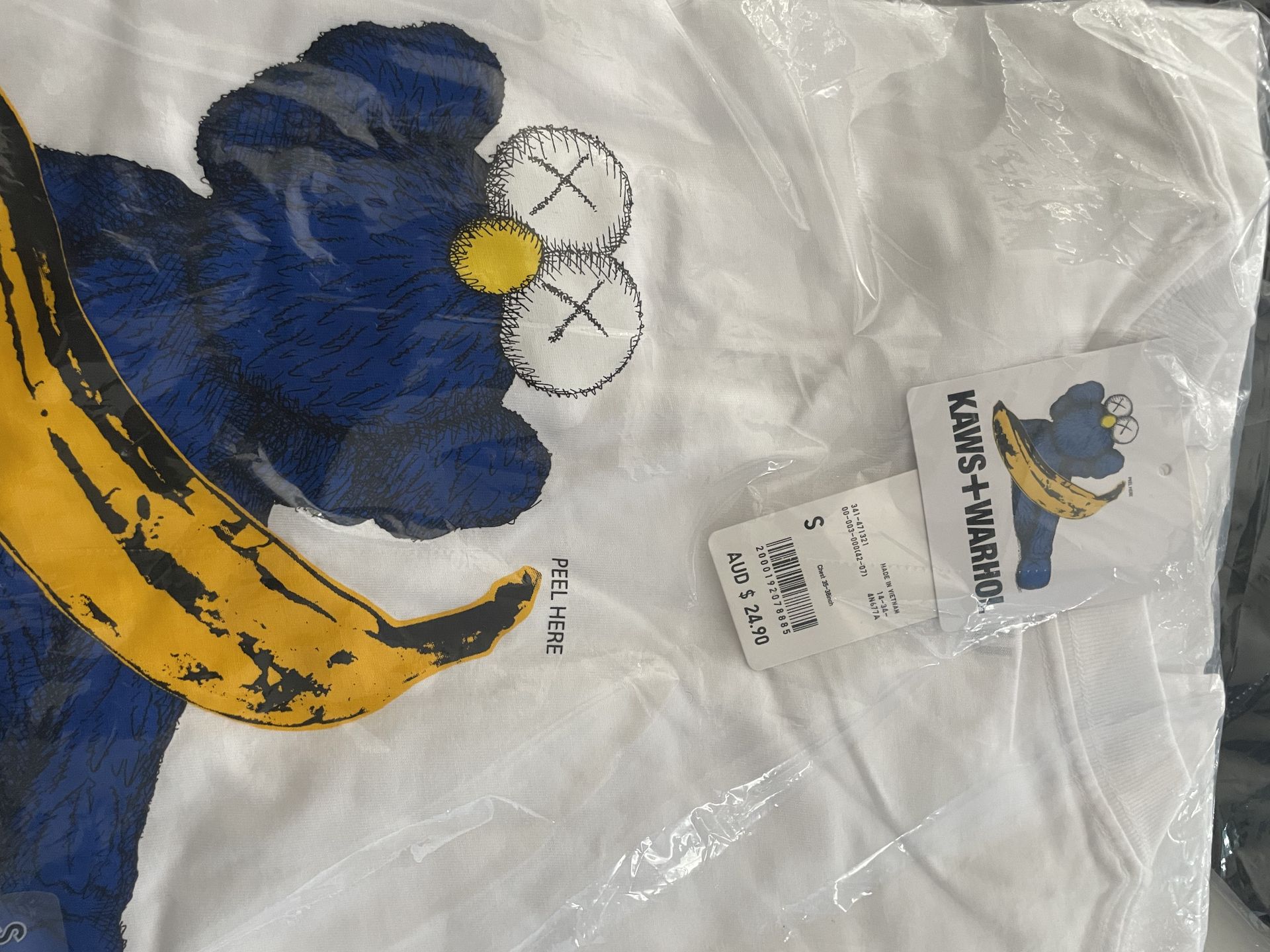 New Uniqlo KAWS Warhol UT graphic tee. Has the blue Kaws Companion holding a banana design. Size S, still in original package with tags. Cool shirt for a KAWS or Warhol fan!