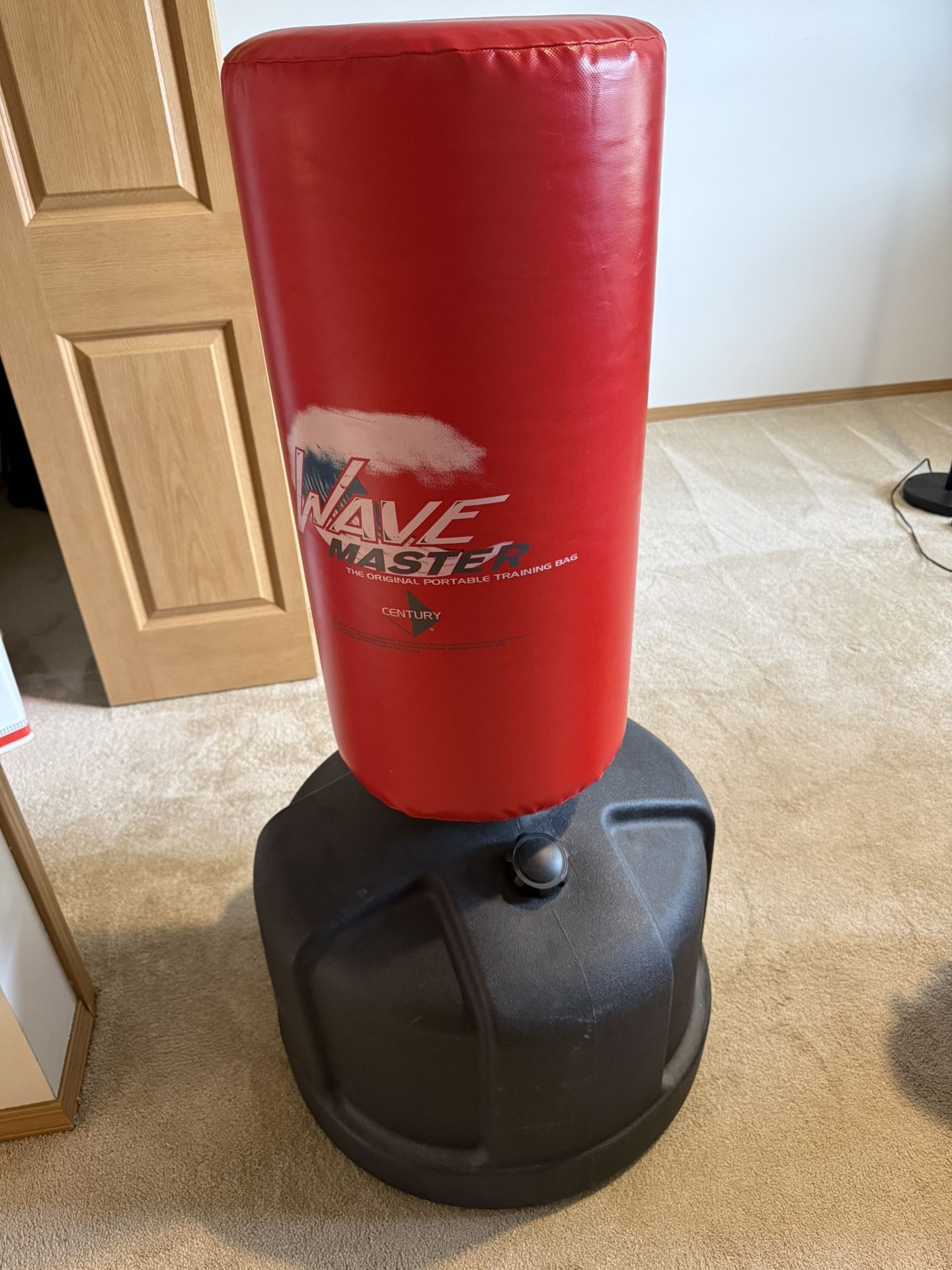 High-quality Century Wavemaster Original training bag. Perfect for cardio, kickboxing, and martial arts practice. • Condition: Very lightly used. No tears or leaks in the vinyl bag. • Features: Adjustable height settings. The base can be filled with sand or water for maximum stability (currently [filled/empty]—please specify). • Brand: Century (The industry standard for freestanding bags). Currently filled with sand • Price: $95 obo • Location: Duvall pickup.
