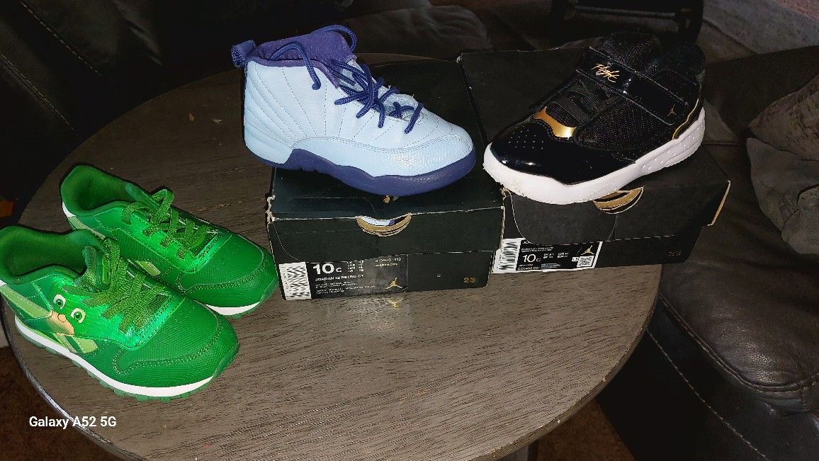 1 Rebook PJ Mask Gecko 1 Jordan 12 Retro GT Bluecap/metallic silver 1 Jordan Max Aura 4 Black Metallic gold-white All have been barely worn and in good condition $75 for all three or $30 each