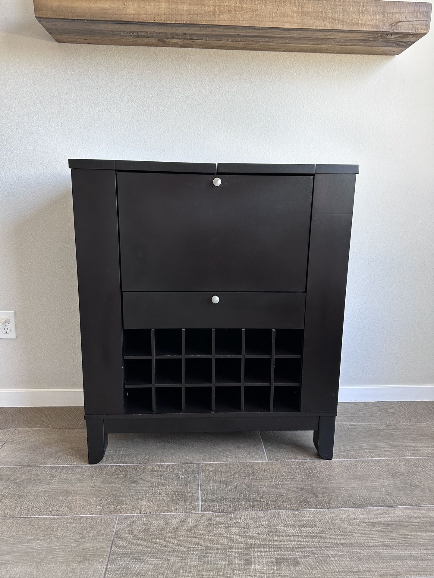 Black bar cabinet in great condition FEATURES: - Double racks with railing for bottles on both sides (4 total) - 18 Wine bottle holder - Drawer for accessories/bar tools - Top opens up on both sides separately & also front cabinet door drops down (see 2nd picture) MEASUREMENTS W: 32” x H:37” x D:13.5”