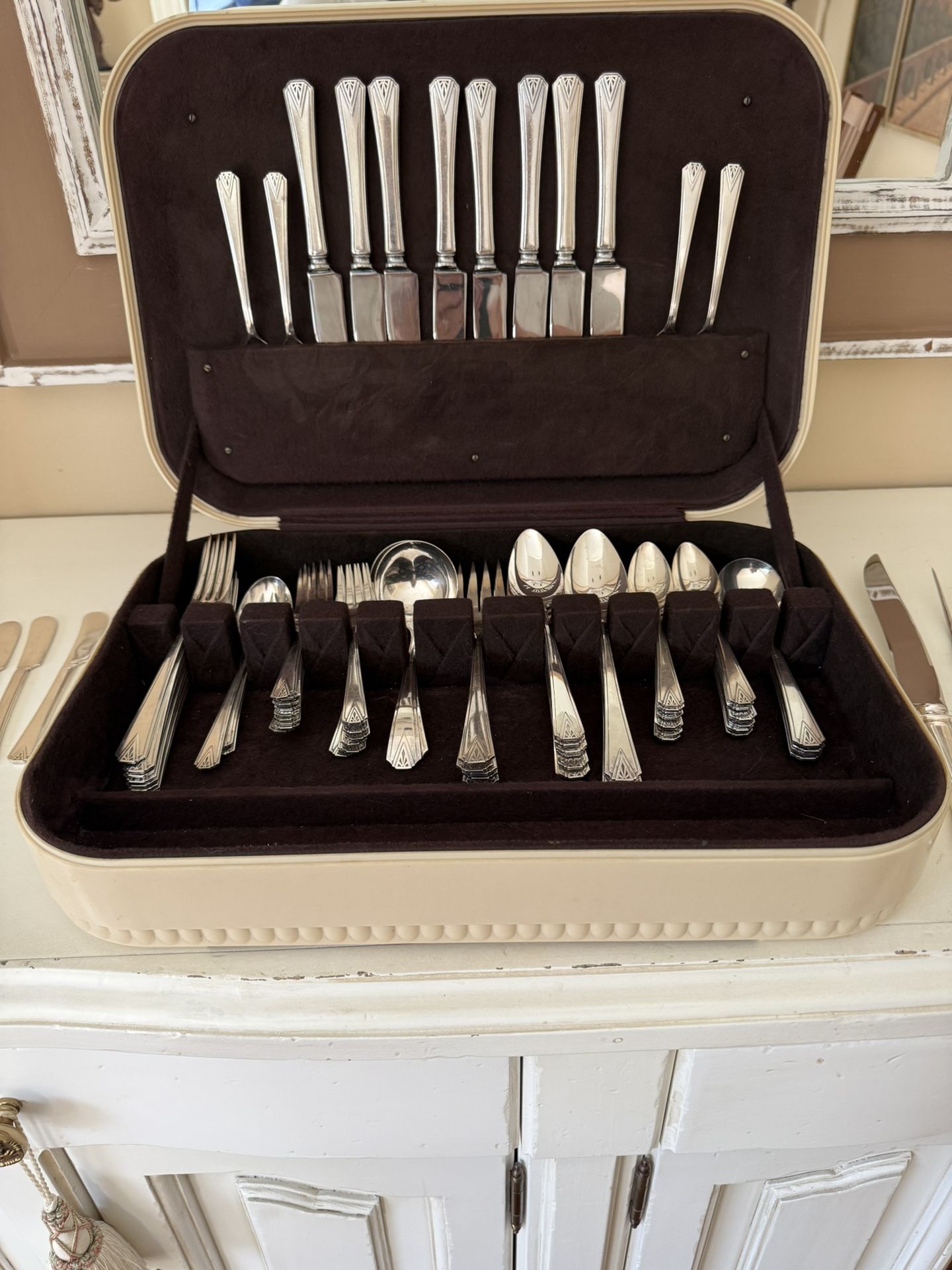 Beautiful vintage Community / Oneida silverplate flatware set in the highly collectible Deauville pattern, featuring classic Art Deco stepped fan detailing. Deauville is one of the most sought-after Community patterns from the 1920s–1930s. This substantial 92-piece set includes multiple place settings, an exceptional assortment of serving pieces, and the original white Bakelite flatware chest, which adds significant collector value. Piece count includes: • 8 dinner knives • 8 dinner forks • 17 salad forks • 8 soup spoons • 16 teaspoons • 8 butter spreaders • 4 cream soup spoons • 1 olive fork • 2 master sugar spoons • 4 master butter knives • 2 soup ladles • 5 serving forks • 7 serving spoons • 1 carving knife • 1 carving fork All pieces are in great vintage condition with a bright shine. Some pieces show light surface marks consistent with age and use. Please review all photos for details and condition. Asking $345 OBO! Please comment or message with any questions.