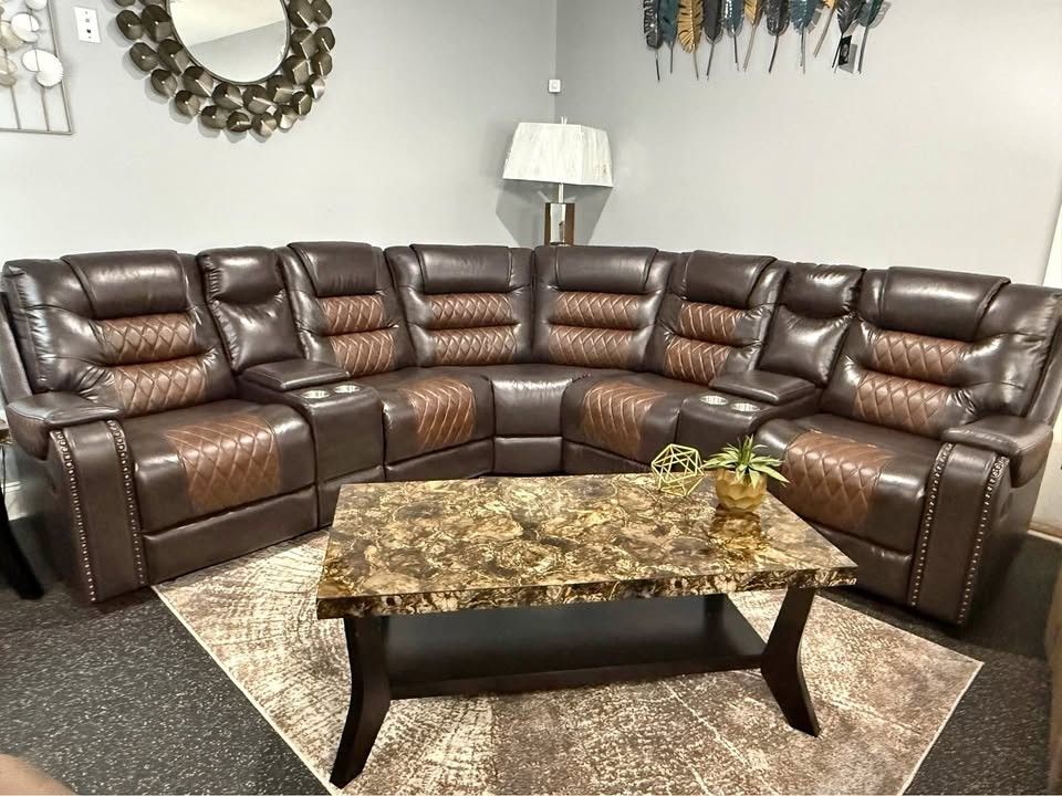 Check out this rustic brown manual-reclining sectional now available for delivery — built tough, insanely comfortable, and perfect for busy households with kids, pets, and constant movie nights. This set features: • Manual Recliners (smooth, easy pull-motion) • Supportive Seating for all-day comfort • Thick, Durable, Easy-Clean Upholstery — great for high-traffic homes • Rustic Country Style with quilted accents & nailhead trim • Built to Handle Real Family Life — no delicate materials, no fuss This set is EVERYTHING.