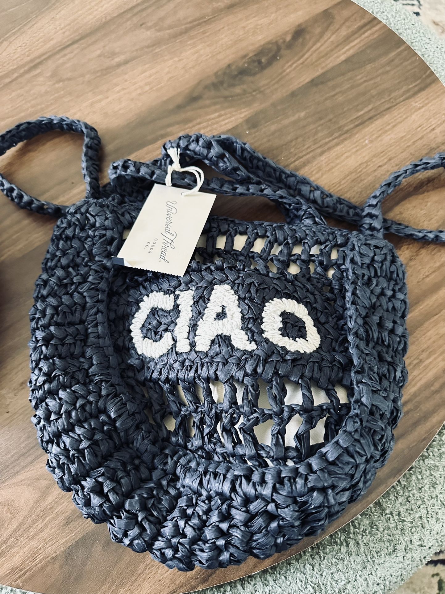 Super cute and on-trend mini woven raffia crossbody bag in black with embroidered “CIAO” lettering in cream/white. Still has the original tag attached — never used! ∙ Style: Mini crossbody / top handle tote ∙ Color: Black with cream lettering ∙ Material: Woven raffia/straw ∙ Straps: Adjustable crossbody strap + short top handles ∙ Condition: New with tags ∙ Open-weave design with interior lining ∙ Perfect for summer, beach days, vacations, or festivals