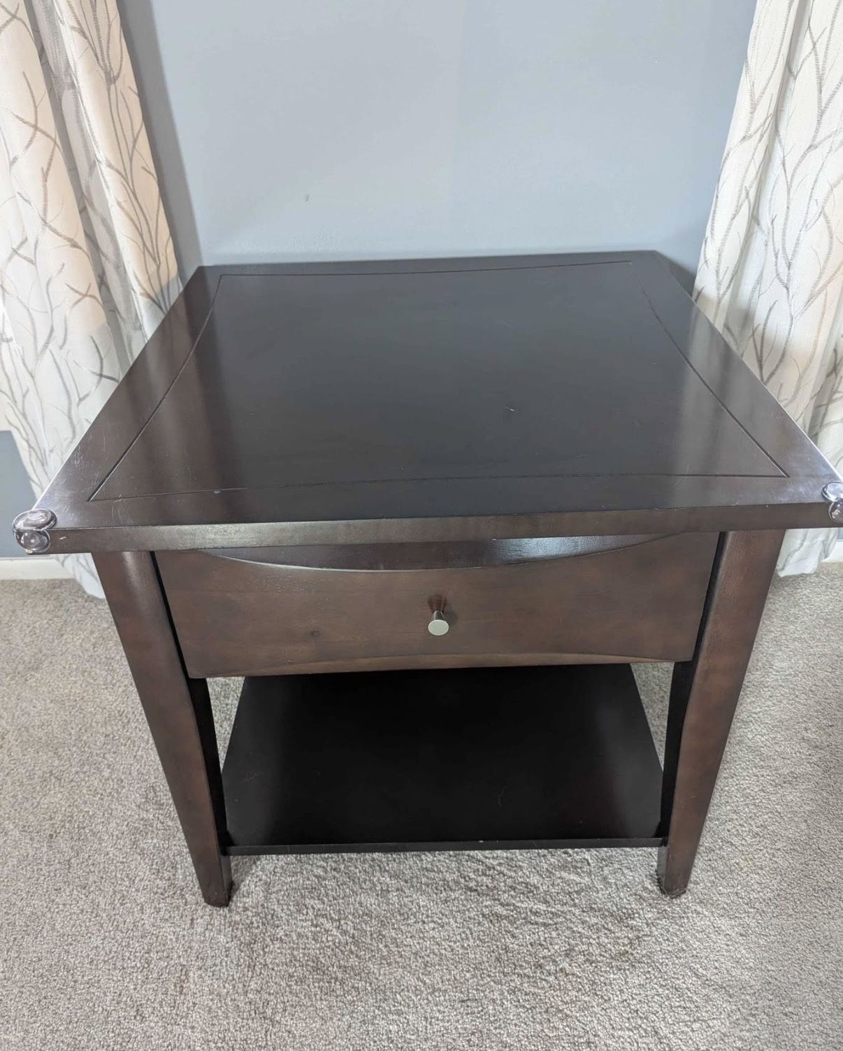 End/Side Table Cappuccino Brown that is part of the Coaster Furniture Whitehall Collection. Dimensions are 25.5" L x 25.5" W x 23.25" H Asking $50. Item is in good condition with a couple of nicks. Product details are listed below and please reach out with any questions. Features: •Wood Veneers & Solids •Simple metal knobs •Deep dark Cappuccino finish •Chambered drawer fronts, clean lines, shaped legs •Lower Shelf •Smooth tops with straight edges •Constructed of hardwood solids and maple veneers I have two additional tables that are part of the set. Please see my listings or reach out if you have any questions, thanks.