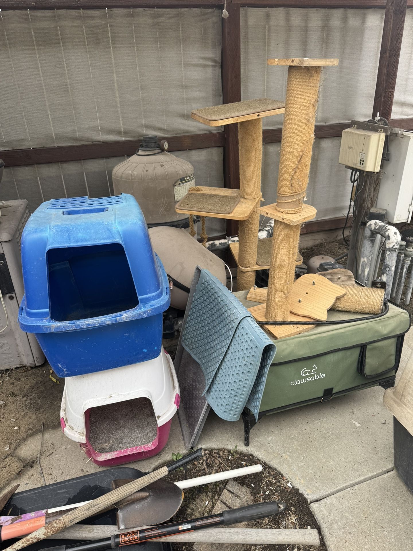 Litter boxes, climbing structures designed for catios or cages, can also be screwed against a wall, food tray and mat, heated dome/bed. Clawsable not included