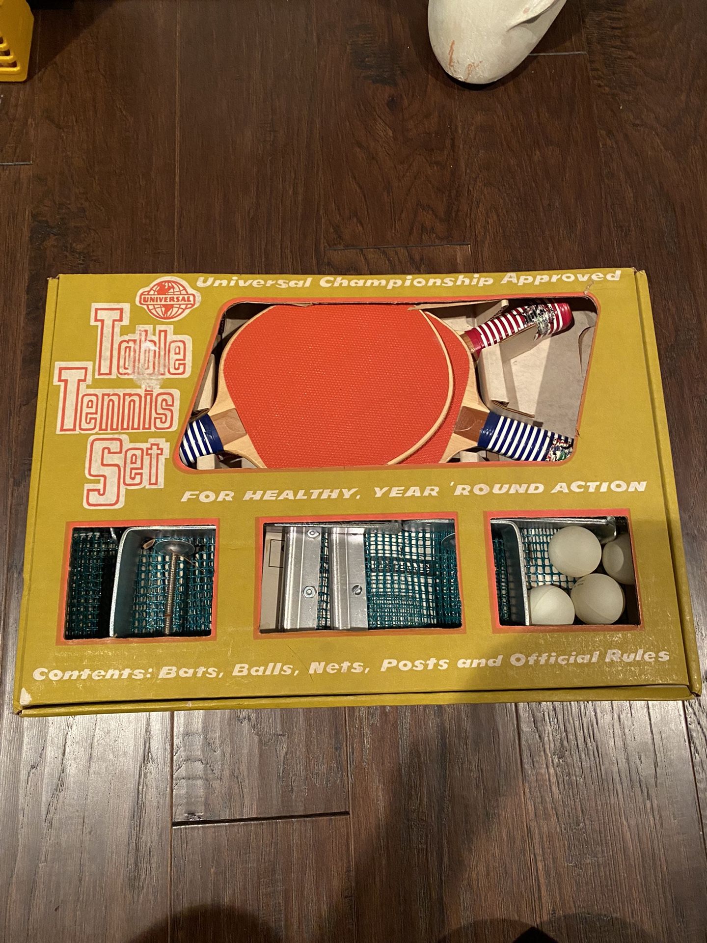 Vintage Universal Table Tennis Set 8000. The two red pats have one side damaged due to aging.