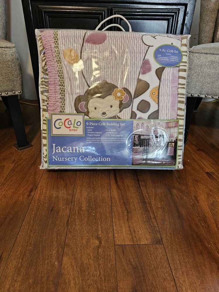 Jacaranda 9 piece set includes: -quilt (40" x 47") -dust ruffle (14" drop) -printed fitted sheets (28" x 52" crip mattress) -window valance (53 across with 12" drop) -diaper stacker (25" x 12" and 9" deep) -2 wall hangings (10" x 10") -1 wall hanging (10" x 9.25")I