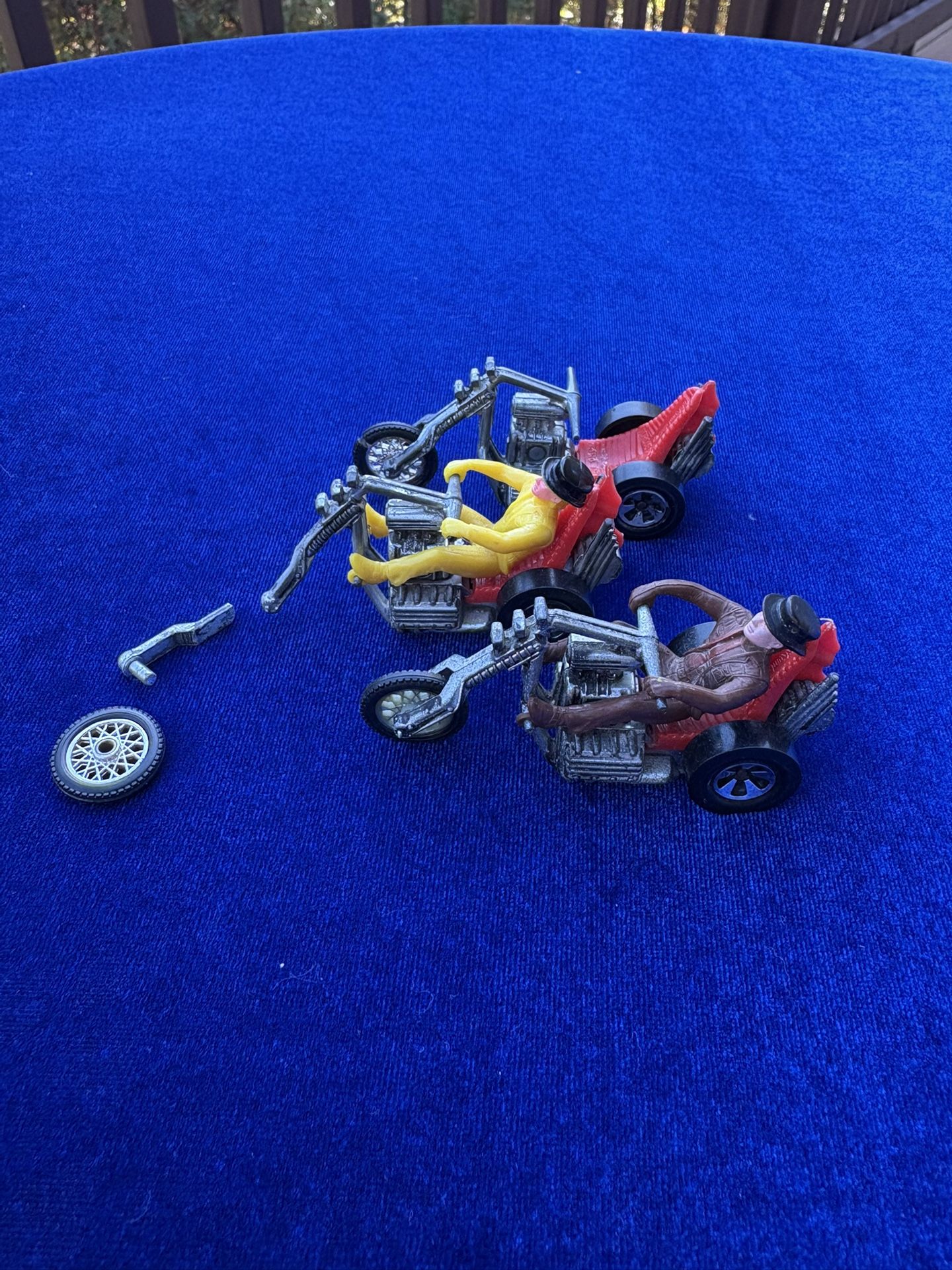 Lot of 3 Torque Chop Rrrumblers Brown rider and bike are in good condition Yellow rider in good condition, but bike’s fork is broken. It’s temporarily threaded to keep it on its wheel. Could be glued to keep it solid. 3rd Rrrumbler has a split on its front tire. Still a really nice 3 piece collection to have! Asking $135 for 3