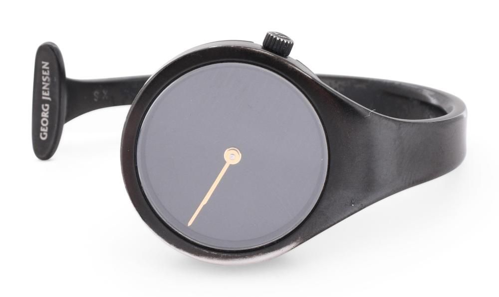Georg Jensen 336 Vivianna Matte Black PVD Stainless Steel Bangle Watch, 27mm, band size XS. Great condition, as pictured. A masterpiece in Scandinavian minimalist design, this Vivianna bangle watch, made from stainless steel coated in matt black PVD, is a striking piece of sculptural jewellery as much as it is a timepiece. Originally designed in 1969, the watch has no numbers, but a plain dial held in a case that seamlessly flows into the bangle. Vivianna Torun Bülow-Hübe was one of our most prolific and influential designers. Her uncompromising approach to her work celebrated simplicity and functionality and her pieces have truly stood the test of time. The Vivianna watch is beautifully crafted from PVD-coated stainless steel. The 27 mm case has a Swiss quartz movement that gives perfect time keeping.