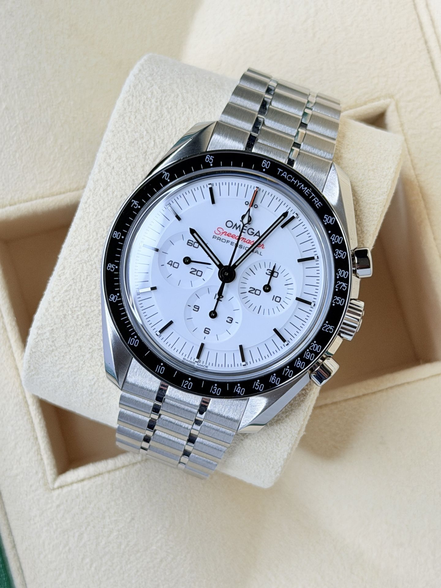 Up for sale is this Omega Speedmaster Moonwatch Professional 310.30.42.50.04.001 ( (contact info removed)4001 ) with the white gloss lacquer dial. This watch is great condition. It comes as a full set, including the Omega box, outer box, warranty card dated late 2024, and pictogram cards. Private showroom located in San Diego, CA. Reach out to schedule an appointment. All my watches are guaranteed 100% authentic, and I will stand by their authenticity. California buyers without a seller’s permit are subject to sales tax.