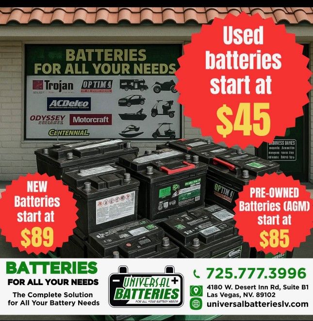 🔋1. USED BATTERIES FROM ONLY $45! Don’t overspend! If your battery died, we’ve got you covered with reliable used batteries starting at just $45. âś… Tested and Guaranteed âś… Ready for Installation âś… Super Affordable 📍 Come today and get your car running again without breaking the bank! 📞 725.777.3996 📍 Universal Batteries LV 4180 W Desert in rd suite B-1. #UsedBatteries #LasVegasDeals #universalbatteries 🔋1. ¡BATERĂŤAS USADAS DESDE SOLO $45! ¡No gastes de más! Si tu baterĂa ya no sirve, aquĂ tienes la soluciĂłn: baterĂas usadas desde solo $45 âś… Probadas y garantizadas âś… Listas para instalar âś… SĂşper econĂłmicas 📍 Ven hoy mismo y pon tu auto en marcha sin vaciar tu bolsillo. 📞 7257773996 📍 Universal Batteries lv 4180 w Desert rd suite b-1 #BaterĂasUsadas #OfertasLasVegas #UniversalBatteries