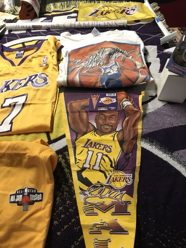 NBA AND L. A. LAKERS AND PLAYERS MEMORABILIA. Includes RICK FOX JERSEY $75, 2004 NBA ALL STAR JAM TEE $15, 87/88 LAKERS WORLD CHAMPS back to back $125, 2001 CHAMPS FINAL TEE $35. MALONE BOBBLEHEAD $15 and BANNER $15, 2003 MAGIC MIDSUMMERS NIGHT TEE $25. All are obo (best offer) Price vary